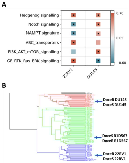 The molecular mechanisms driving acquired docetaxel resistance are diverse. We first developed a collection of docetaxel-resistant PC cell-lines by chronically exposing the sensitive parent lines to sub-lethal dosages of docetaxel. The resistant PC cell-lines thus established exhibited on average 10–100 times greater IC50s for docetaxel when compared to the parent lines [34,35]. Subsequently, RNA sequencing was performed to obtain the transcriptomic profiles of docetaxel-sensitive and docetaxel-resistant PC cell-lines. Our findings suggest that molecular perturbations induced by acquired docetaxel resistance are indeed specific to the tumor subtype. As shown in Figure 6A, by performing GSEA pathway enrichment analysis on differentially expressed genes between docetaxel-sensitive (doceS) and docetaxel-resistant (doceR) clones, separately for 22RV1 and DU145 (representing distinct CRPC subtypes (Figure 2A)), differential patterns of molecular pathway enrichment were revealed. Specifically, upregulation of the GF/RTK/Ras/ERK signaling pathway and ABC transporters was observed in the doceR 22RV1. However, the same GF/RTK/Ras/ERK pathway was significantly downregulated in doceR DU145. Conversely, the doceR DU145 exhibited enrichment of the PI3K/Akt/mTOR pathway, which was absent in 22RV1. Indeed, previous publications have associated these mechanisms with the development of docetaxel resistance in PC [36,37,38,39,40,41]. In light of these findings, we reasoned that combinatorial therapies targeting these distinct molecular vulnerabilities are more likely to be effective in heterogeneous docetaxel-resistant CRPC tumors.