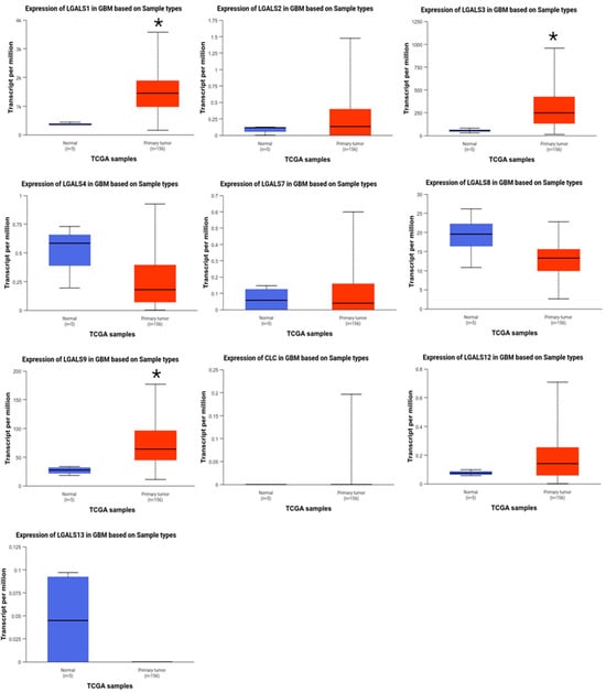 Comparison between the mRNA expression of galectins in glioblastoma versus normal tissue (UALCAN). Gene expression (transcripts per million) of normal brain tissue (blue; n = 5) and primary glioblastoma (red; n = 156) was examined for the human galectin family. LGALS1, LGALS3, and LGALS9 were significantly overexpressed in glioblastoma samples compared to normal brain tissue. No data was available for LGALS14 and LGALS16. * p ≤ 0.05.