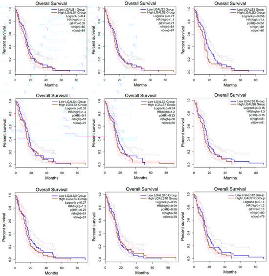 Overall survival (OS) curves for glioblastoma patients from the GEPIA2 database. Kaplan–Meier curves compare OS between high- (red line) and low-expression (blue line) groups for each LGALS gene, defined using the median expression cut-off. Dotted lines indicate the 95% confidence intervals for each curve and do not represent additional patient groups or independent survival curves. Log-rank p values and hazard rations (HRs) were computed using a COX proportional hazard model. No data was available for LGALS13, LGALS14 and LGALS16.