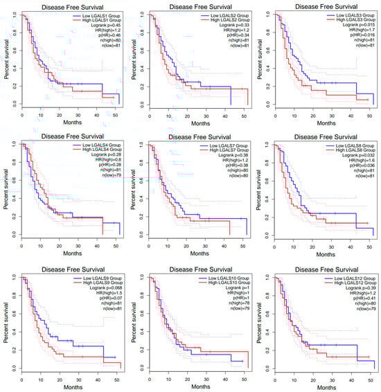 Disease-free survival (DFS) curves for glioblastoma patients from the GEPIA2 database. Kaplan–Meier curves compare DFS between high- (red line) and low-expression (blue line) groups for each LGALS gene, defined using the median expression cut-off. Dotted lines indicate the 95% confidence intervals for each curve and do not represent additional patient groups or independent survival curves. Log-rank p values and hazard rations (HRs) were computed using a COX proportional hazard model. No data was available for LGALS13, LGALS14, and LGALS16.