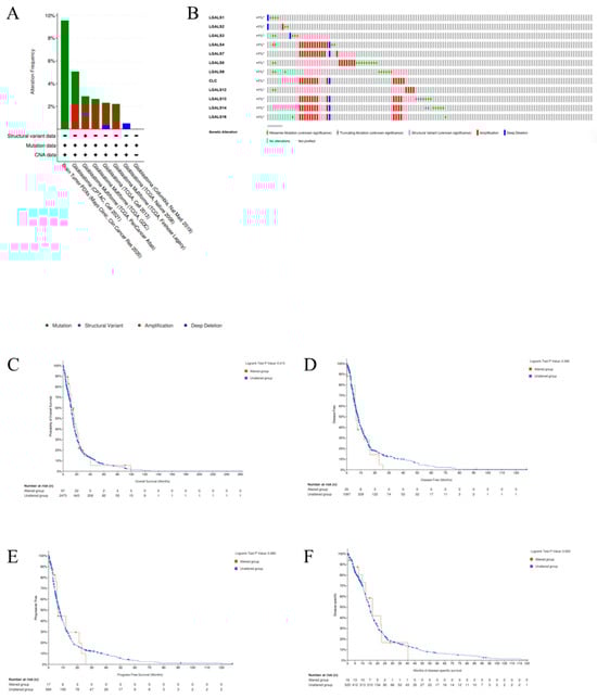 Amplifications were most frequently observed in LGALS4, LGALS7, LGALS10, LGALS13, LGALS14, and LGALS16, whereas missense mutations were more common in LGALS8 and LGALS9. Deep deletions were detected across most galectin genes, except for LGALS8 and LGALS9. Truncating mutations and structural variants, though rare, were identified in LGALS13 and LGALS14. To evaluate the clinical significance of LGALS alterations, we examined their association with key survival metrics, including overall survival (OS) (Figure 5C), disease-free survival (DFS) (Figure 5D), progression-free survival (PFS) (Figure 5E), and disease-specific survival (DSS) (Figure 5F). No significant differences were observed across any survival metric.