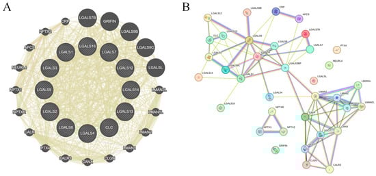 Gene–gene network of galectin family members in glioblastoma. (A). GeneMANIA-derived gene–gene interaction network showing functional associations among galectin family members and their top co-expressed genes. Node size reflects connectivity (degree), while edge width represents interaction strength. All edges are displayed using GeneMANIA’s default unified colour scheme and do not distinguish between specific interaction types. (B). STRING protein–protein interaction (PPI) network of galectin family members and correlated genes. Edges represent confidence-weighted interactions based on integrated evidence (experimental data, curated databases, co-expression, and text mining). Node colour reflects STRING clustering and does not indicate interaction type.