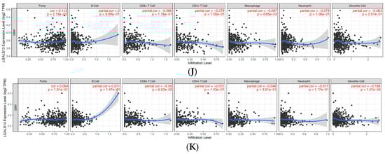 Correlations of galectin family gene expression with immune infiltration level in glioblastoma. The correlation between each type of TIICs (B-cells, CD4+ T cells, CD8+ T cells, neutrophils, macrophages, and dendritic cells) and (A). LGALS1, (B). LGALS2, (C). LGALS3, (D). LGALS4, (E). LGALS7, (F). LGALS8, (G). LGALS9, (H). LGALS10/CLC, (I). LGALS12, (J). LGALS13, and (K). LGALS14. No data was available for LGALS16.