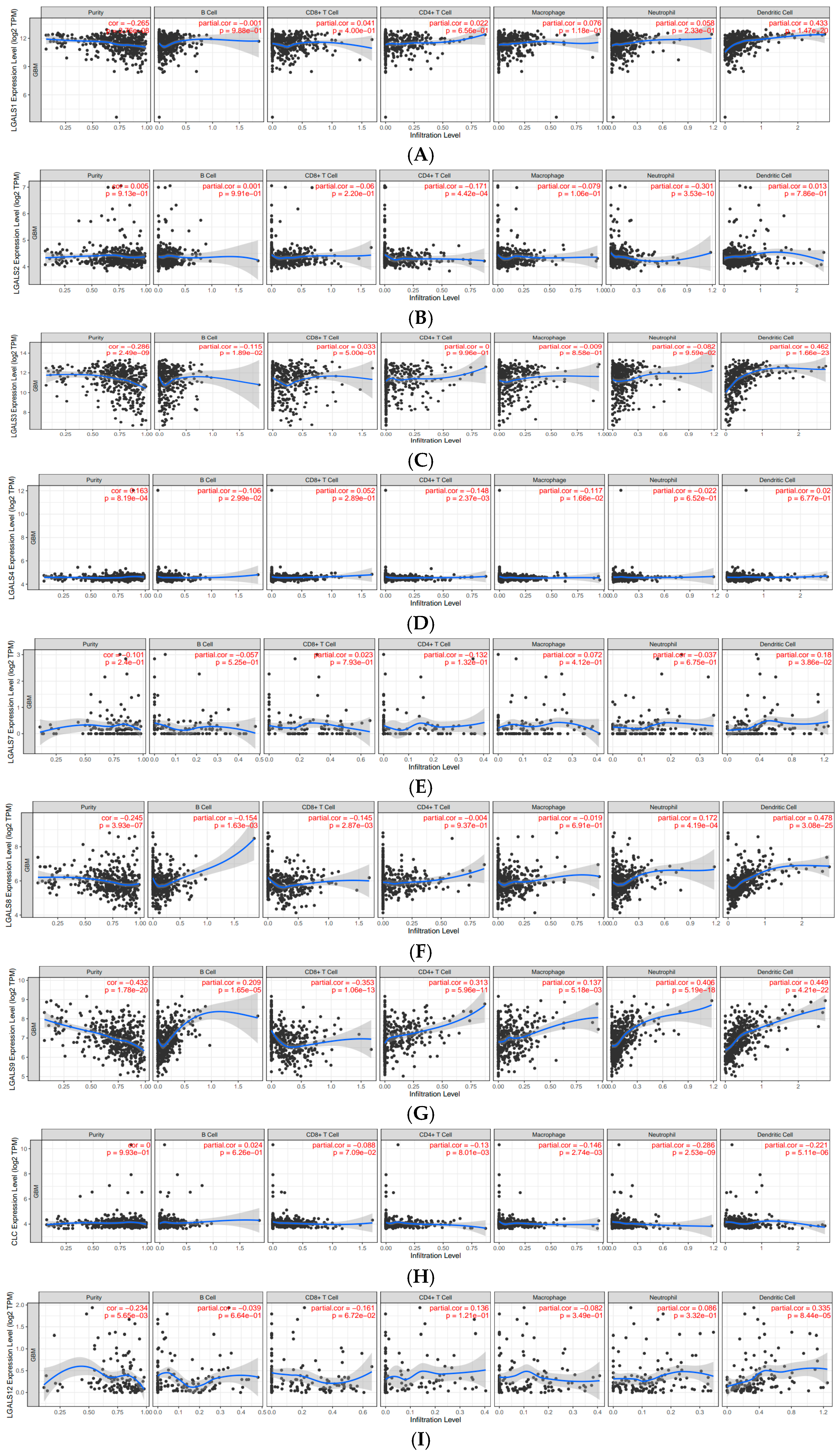 | LGALS8 | −0.154 | −0.145 | −0.004 | −0.019 | 0.172 | 0.478 |