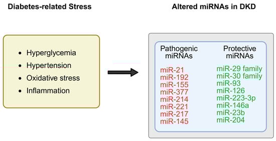 Under diabetic conditions, metabolic stress such as hyperglycemia, inflammation, and oxidative stress has been associated with dysregulation of specific microRNAs (miRNAs) in the kidney, which may promote pro-fibrotic and pro-inflammatory pathways, while protective miRNAs are downregulated, resulting in loss of inhibition on fibrotic genes and signaling cascades. Created in BioRender. Zhang, C. (2025) https://BioRender.com/8dgml63.