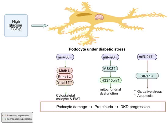 Podocytes are highly specialized epithelial cells that form the slit diaphragm of the glomerular filtration barrier. Their structural and functional integrity is essential for maintaining selective permeability of the glomerulus. Under diabetic conditions, these cells are exposed to persistent metabolic and hemodynamic stress, leading to apoptosis, cytoskeletal disruption, and detachment from the glomerular basement membrane—hallmarks of DKD. Accumulating evidence has demonstrated that multiple microRNAs (miRNAs) play crucial roles in these pathological processes by fine-tuning gene expression involved in cytoskeletal dynamics, apoptosis, and ECM production [42,63,64].