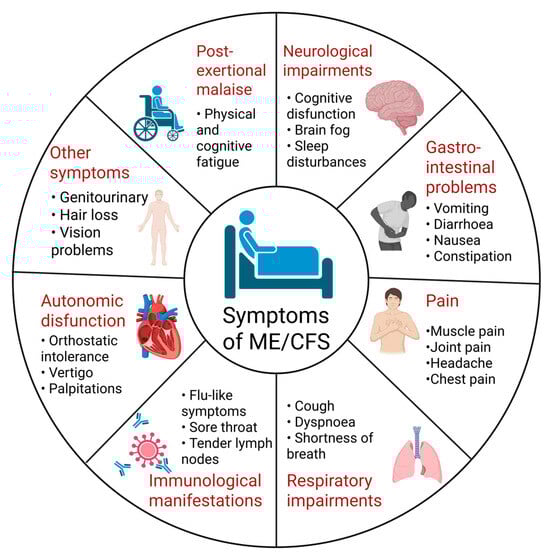 Overview of common clinical manifestations of ME/CFS [15,31,32,38]. Created in BioRender. Nikolova, R. (2025) https://BioRender.com/ob3cwtb, accessed on 1 November 2025.