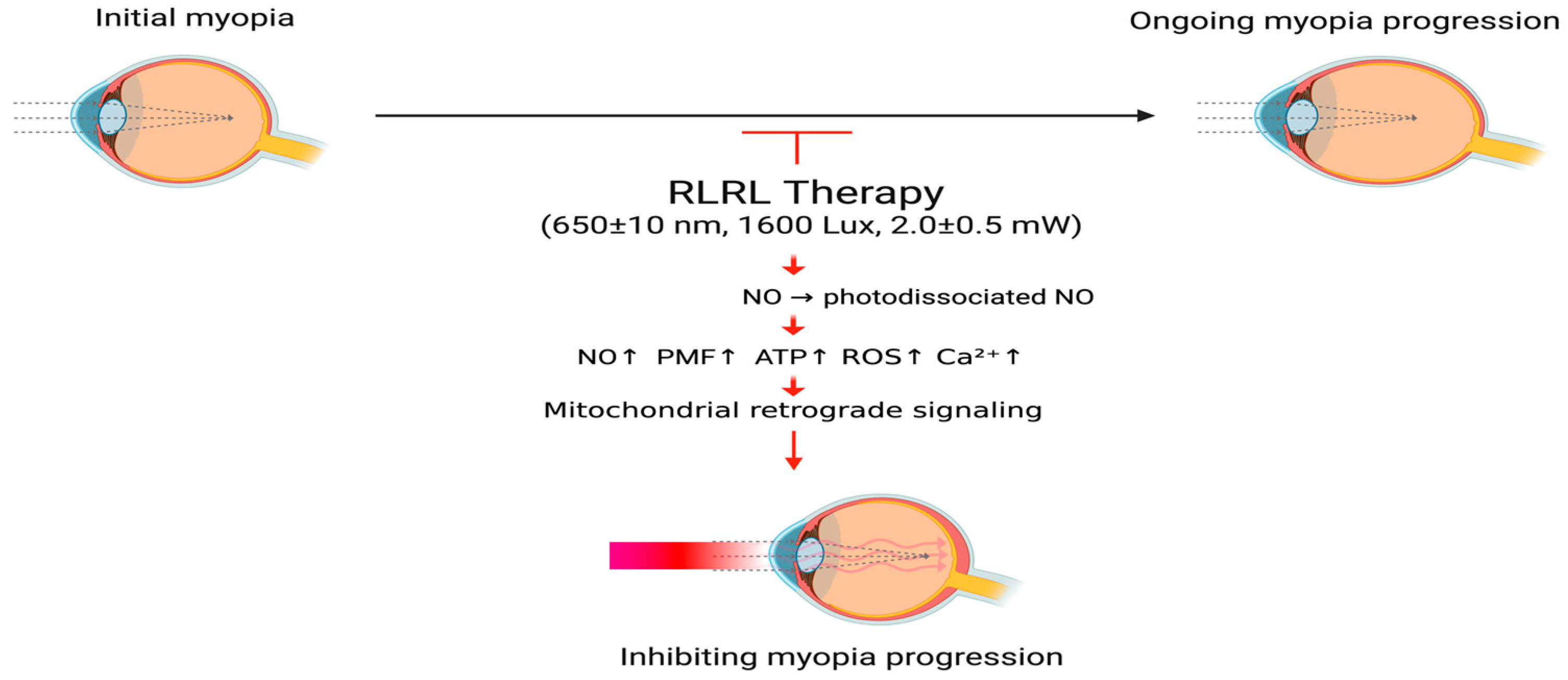 - Zhu, Q.; Cao, X.; Zhang, Y.; Zhou, Y.; Zhang, J.; Zhang, X.; Zhu, Y.; Xue, L. Repeated Low-Level Red-Light Therapy for Controlling Onset and Progression of Myopia-a Review. Int. J. Med. Sci. 2023, 20, 1363–1376. [Google Scholar] [CrossRef] [PubMed]
