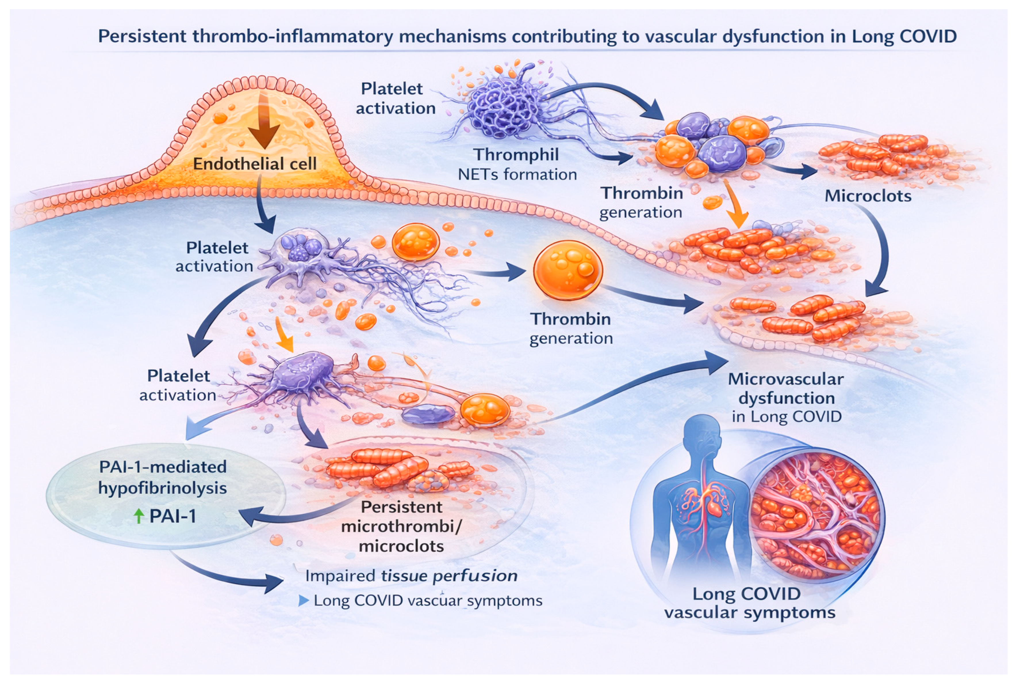 Chicago/Turabian StyleStojanovic, Maja, Marko Djuric, Irina Nenadic, Suzana Bojic, Ana Andrijevic, Aleksa Popovic, and Slobodan Pesic. 2026. "Vascular Complications of Long COVID—From Endothelial Dysfunction to Systemic Thrombosis" International Journal of Molecular Sciences 27, no. 1: 433. https://doi.org/10.3390/ijms27010433