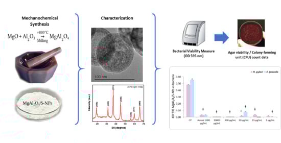 - Chitra, V.P.; Vasantharani, P.; Sivakumar, G.; Santhamoorthy, M.; Guganathan, L.; Devanesan, S.; AlSalhi, M.S.; Palaniappan, S.K. Preparation and characterization of MgAl2O4 nanoparticles by hydrothermal method and their photocatalytic and antibacterial activity applications. Ceram. Int. 2024, 50, 32737–32747. [Google Scholar] [CrossRef]