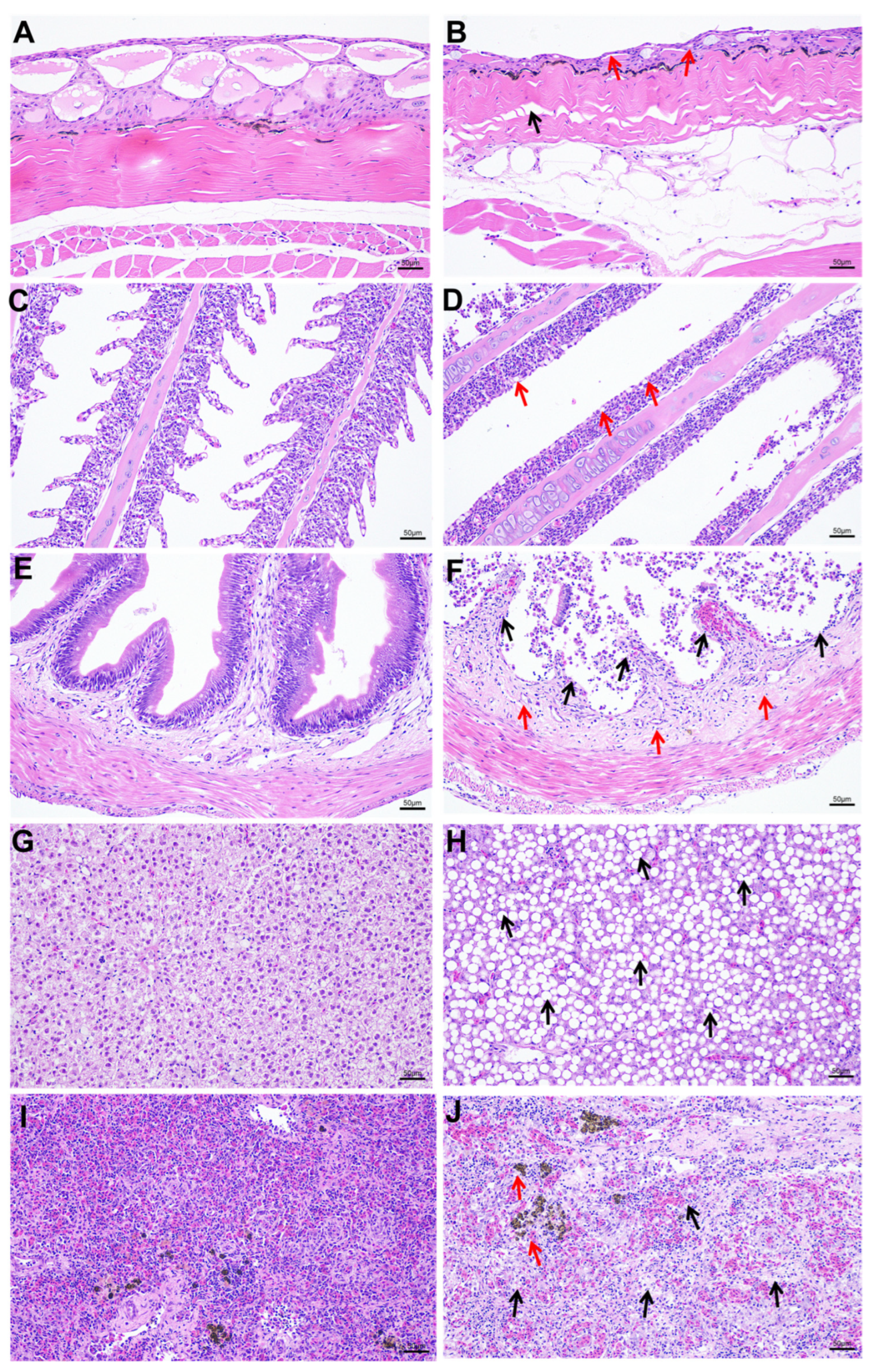 2.2. Histopathological Analysis of Yellow Catfish Infected with V. mimicus