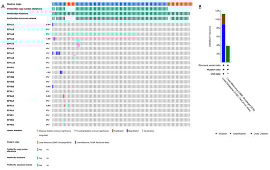 Profile of EFN and EPH gene pathogenic variants (PVs) and copy number alterations (CNAs) in UVM. (A) cBioPortal “Oncoprint” summary of PVs and CNAs in EPH and EFN genes in TCGA-UVM (n = 80) and QIMR-UVM (n = 28). Genomic alterations were infrequent in both UVM datasets. EPHA7 (6q16.1) showed the highest CNA rate, with deep deletions in 4% of patients. Additional deep deletions were observed in EPHA4 (2q36.1; 1.9%), EPHB2 (1p36.12; 1.9%), and EPHB6 (7q34; 0.9%). EFNA2 (19p13.3) exhibited a single amplification event (0.9%). Point mutations were rare and included a truncating mutation (nonsense variant) in EPHA4 (2q36.1; 0.9%) and a missense variant in EFNA4 (1q21.3; 0.9%). Alterations are depicted with different colors (amplification, red; deletion, blue; mutation, green). Rows and columns depict genes and individual patients, respectively. Alteration frequency percentage is noted for each gene. (B) Alteration frequency percentage of EPH and EFN genes in TCGA-UVM (n = 80) and QIMR-UVM (n = 28). Alterations are depicted with different colors (amplification, red; deletion, blue; mutation, green). The asterisks indicate that not all the patients from the QIMR-UVM cohort were profiled for copy number alterations, mutations and structural variants.