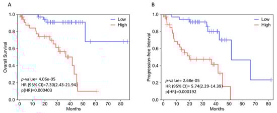Survival analysis of selected EPH/EFN family member gene sets in TCGA-UVM patients, performed by GEPIA3 online software. (A) Kaplan–Meier (KM) curves comparing overall survival (OS) of TCGA-UVM cohort patients with high expression (red, n = 39) and low expression (blue, n = 39) of a gene set including EPHA4, EPHA5, EPHA8, EPHB2, and EFNB2 (B) KM plots comparing progression-free interval (PFI) of TCGA-UVM cohort patients with high expression (red, n = 39) and low expression (blue, n = 39) of a gene set including EPHA4, EPHA5, EPHA7, EPHA8, EPHB2, EFNA2, and EFNB2. p-values were calculated by GEPIA3 using log-rank tests. p < 0.05 was considered as statistically significant. Hazard Ratios (HRs) and 95% Confidence Intervals (CIs) are shown on the graphs. TCGA-UVM, The Cancer Genome Atlas—Uveal Melanoma; GEPIA, Gene Expression Profiling Interactive Analysis.
