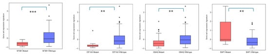 Differential expression of EPHA4, EPHA5, EPHA8, EPHB2, EFNB2 gene set in TCGA-UVM patients harboring SF3B1, EIF1A, GNAQ, and BAP1 mutations, performed by GEPIA3 online software. UVM patients with SF3B1 mutations (red, n = 18), EIF1AX mutations (red, n = 10), and GNAQ mutations (red, n = 39) have downregulated expression of this gene set compared to wild-type SF3B1 (blue, n = 61), EIF1AX (blue, n = 69), and GNAQ (blue, n = 40) patients. On the other hand, patients with BAP1 mutations (red, n = 13) overexpress these genes compared to BAP1 wild-type (blue, n = 66) UVM patients. p < 0.05 was considered as statistically significant. ** refers to p < 0.01; *** refers to 0.001.
