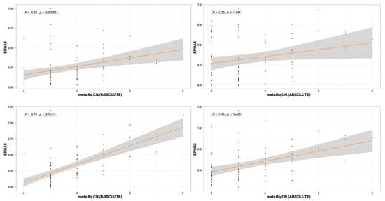 Scatterplot correlation analysis between 8q chromosome copy number in TCGA-UVM patients and levels of EPHA4, EPHA5, EPHA8, and EPHB2, performed by TCGEx software (https://tcgex.iyte.edu.tr/, last accessed on 18 December 2025). The analysis shows a significant positive correlation between cluster numbers and levels of EPHA4, EPHA5, EPHA8, and EPHB2 expression. R represents Spearman’s correlation coefficient.The dark orange line represents the best fitting regression line and the grey area represents 95% confidence interval.