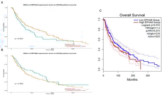 Survival analysis of EPHA5, EPHB2, and EPHA8 expression levels in the TCGA-SKCM cohort. Kaplan–Meier survival curves generated using GEPIA2 (C) and UALCAN (A,B), illustrating the prognostic relevance of EPH/EFN gene expression levels in cutaneous melanoma (TCGA-SKCM). (A) High EPHA5 expression was significantly associated with reduced overall survival (log-rank p = 0.031; n = 117 high, n = 342 low/medium). (B) High EPHB2 expression showed a borderline association with poorer survival (log-rank p = 0.063; n = 115 high, n = 344 low/medium). (C) High EPHA8 expression displayed a non-significant trend toward reduced survival (log-rank p = 0.074; HR = 1.3; p(HR) = 0.073; n = 218 high, n = 223 low). Dotted lines represent 95% Confidence Intervals.