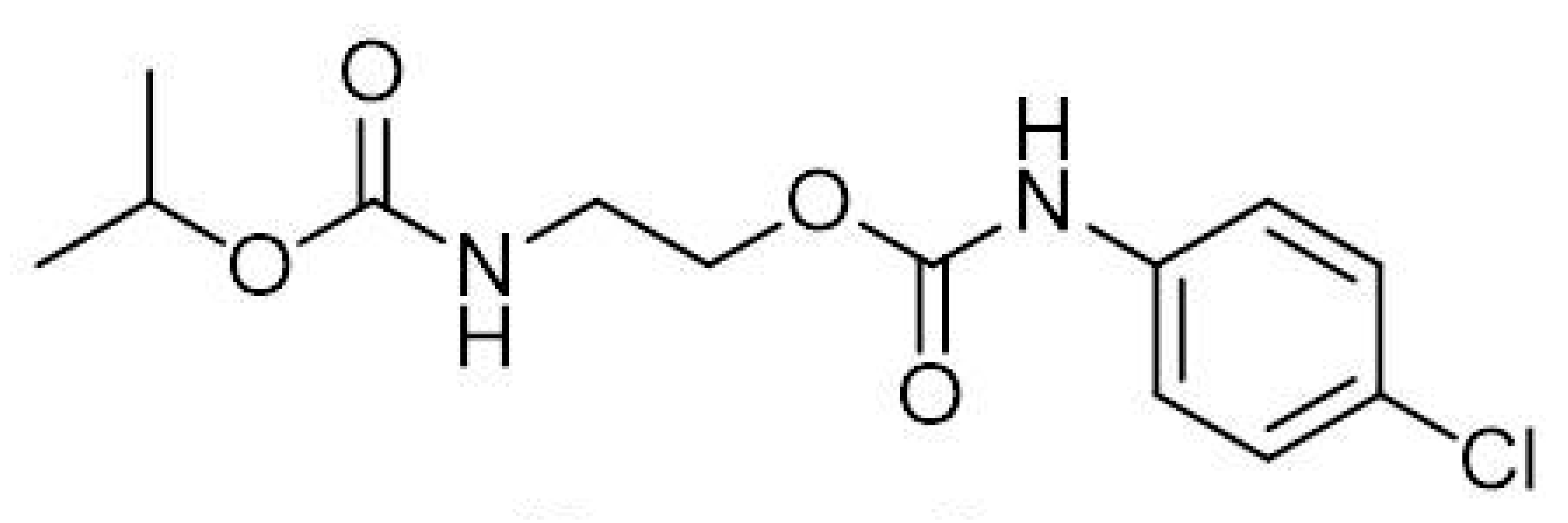 - Baskakov, Y.A.; Shevelukha, V.S.; Simonov, V.D.; Kulaeva, O.N.; Chimishkyan, A.L.; Butenko, R.G.; Shapovalov, A.A.; Nedelchenko, B.M.; Shanbanovich, G.N.; Taschi, V.P.; et al. Carbamoyl Derivatives of Alkanolamines as Plant Growth Regulators. Bulletin of Inventions. Patent SU 1707015 A1, 23 January 1992. [Google Scholar]