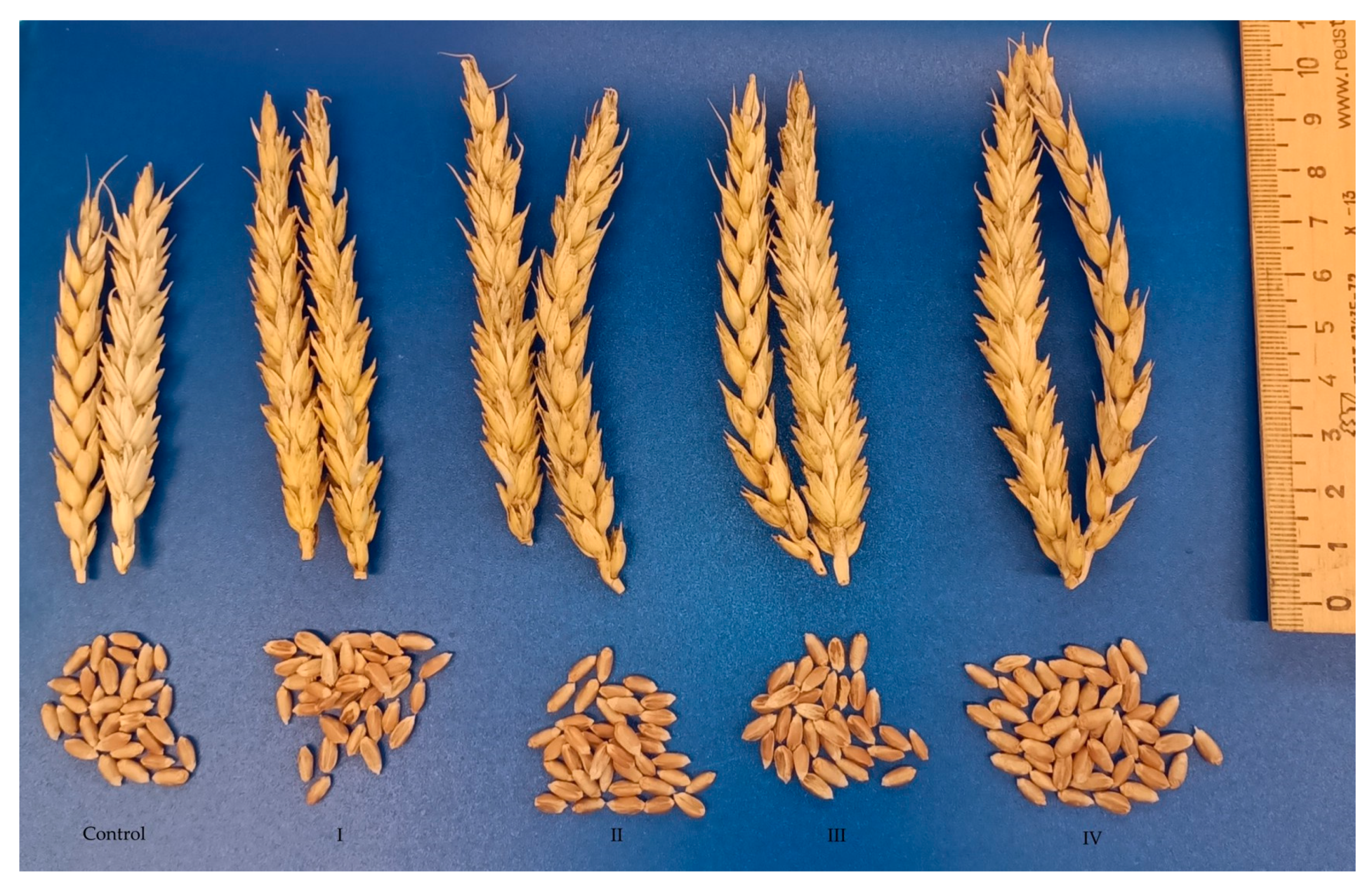 - Hanaa, H.; Safaa, A. Foliar application of IAA at different growth stages and their influenced on growth and productivity of bread Wheat (Triticum aestivum L.). J. Phys Conf. Ser. 2019, 1294, 092029. [Google Scholar] [CrossRef]