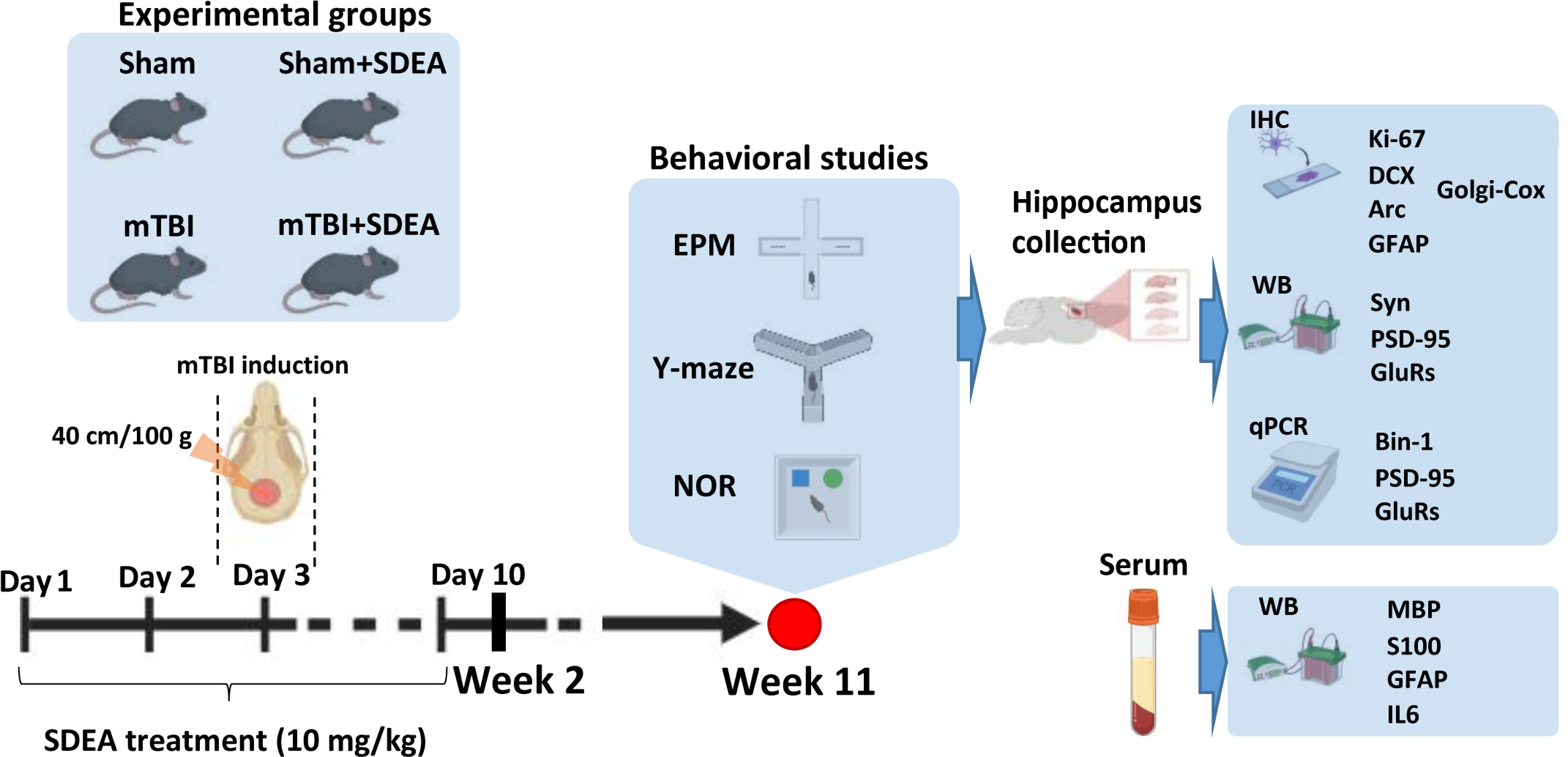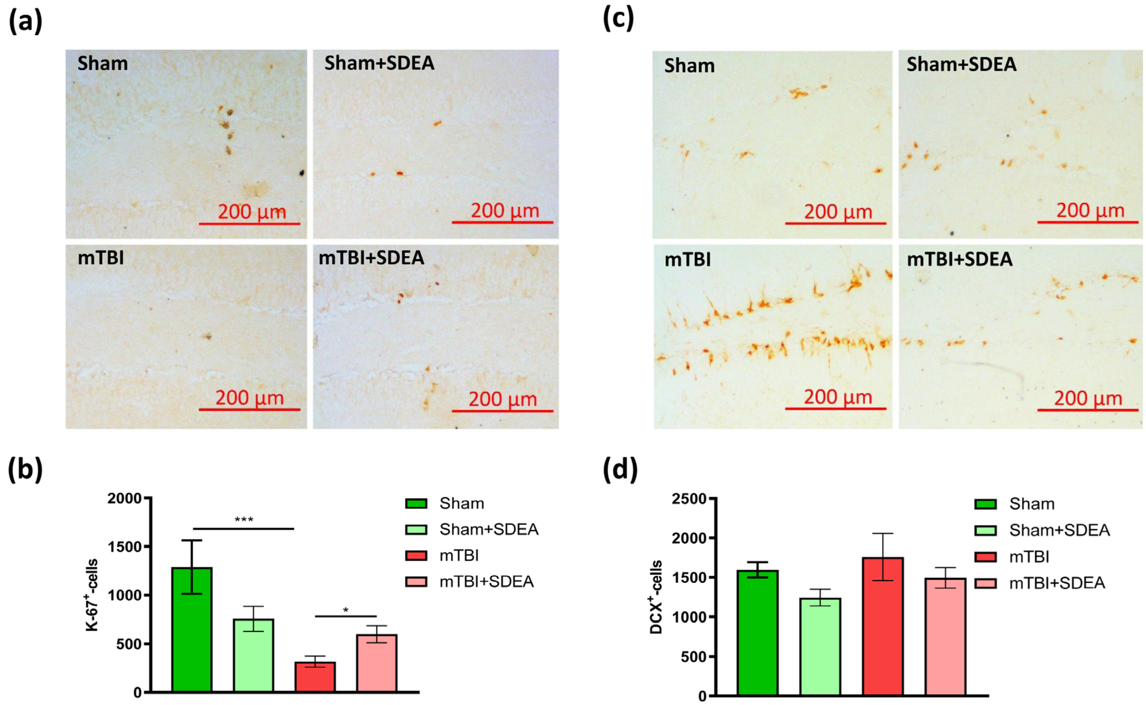 2.2. Effect of mTBI and SDEA Treatment on Hippocampal Neurogenesis