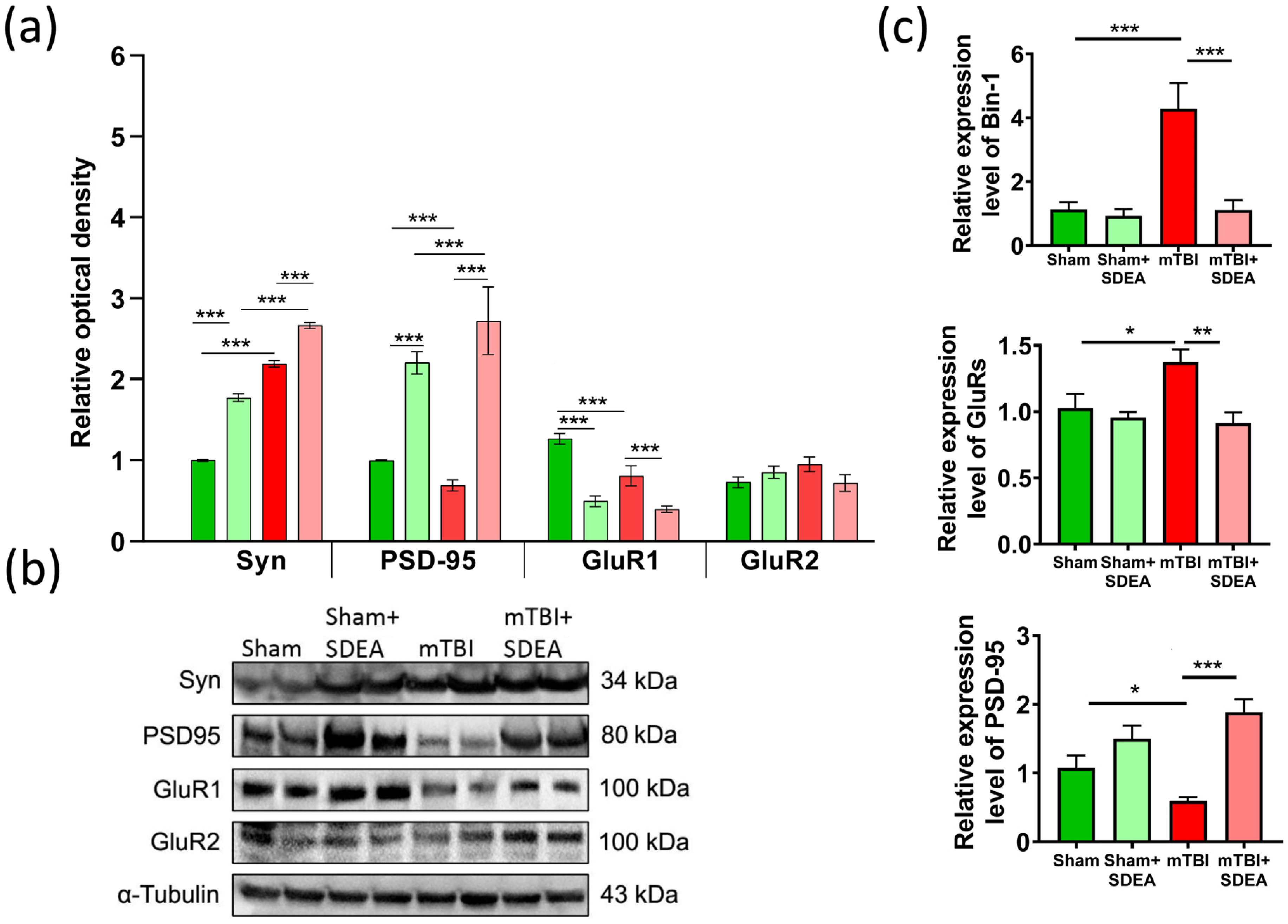 2.6. SDEA Normalizes BIN1 Expression and Restores Synaptic Marker Balance After mTBI