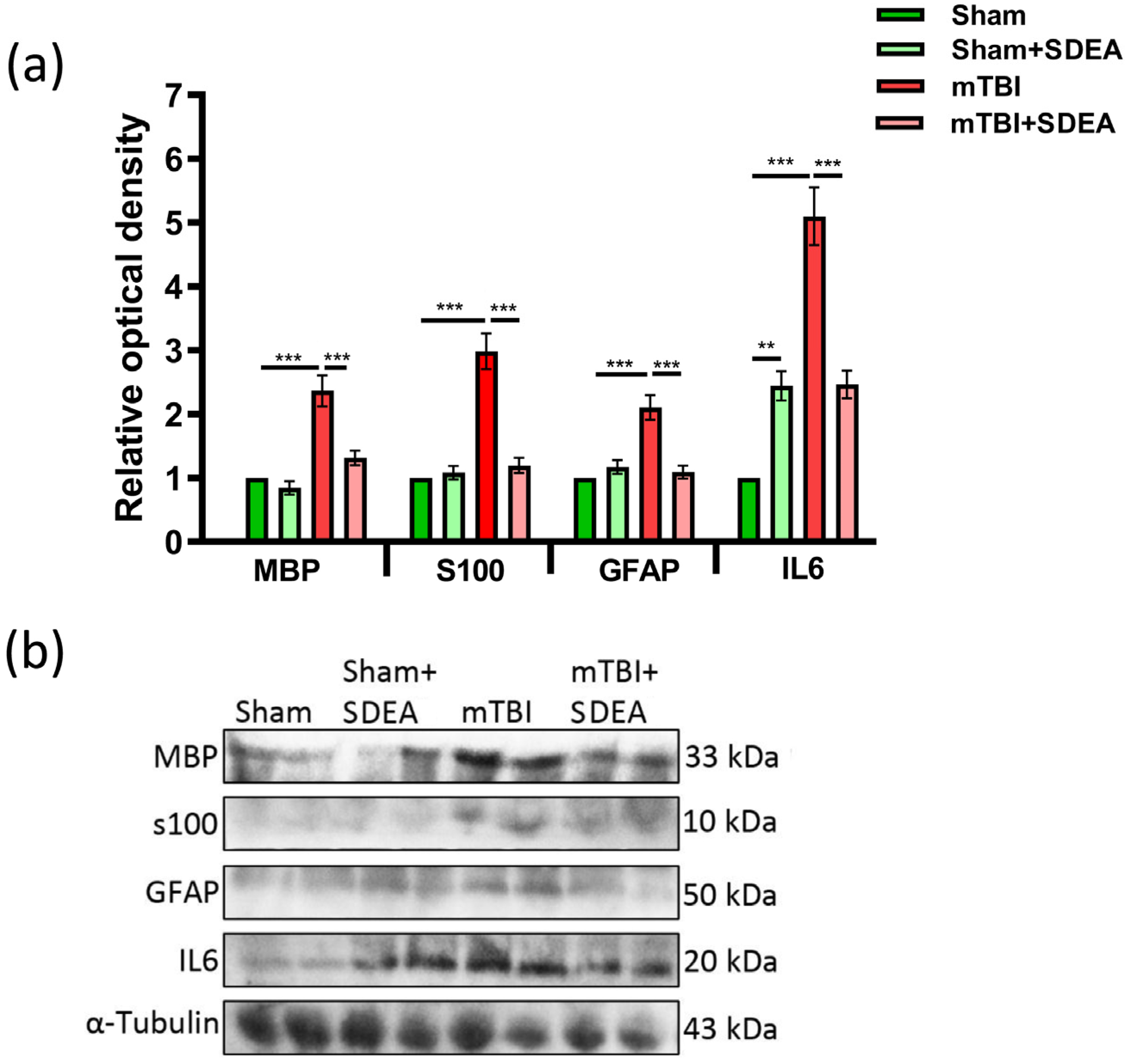2.7. Serum Neuroglial Markers Following mTBI and SDEA Treatment