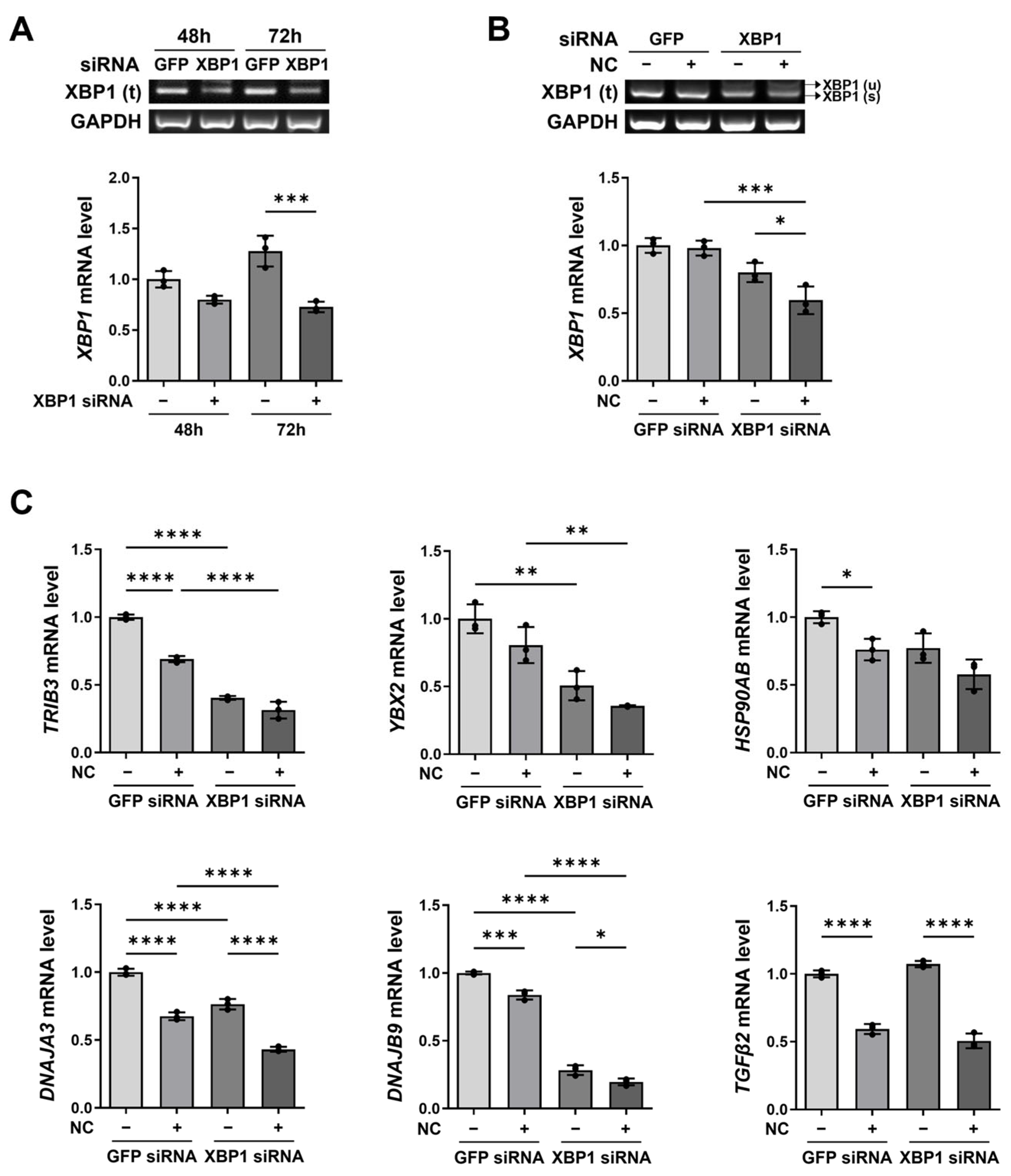2.5. XBP1 Knockdown and Necrotic Cell Treatment Exert Additive Effects on XBP1-Related Gene Expression