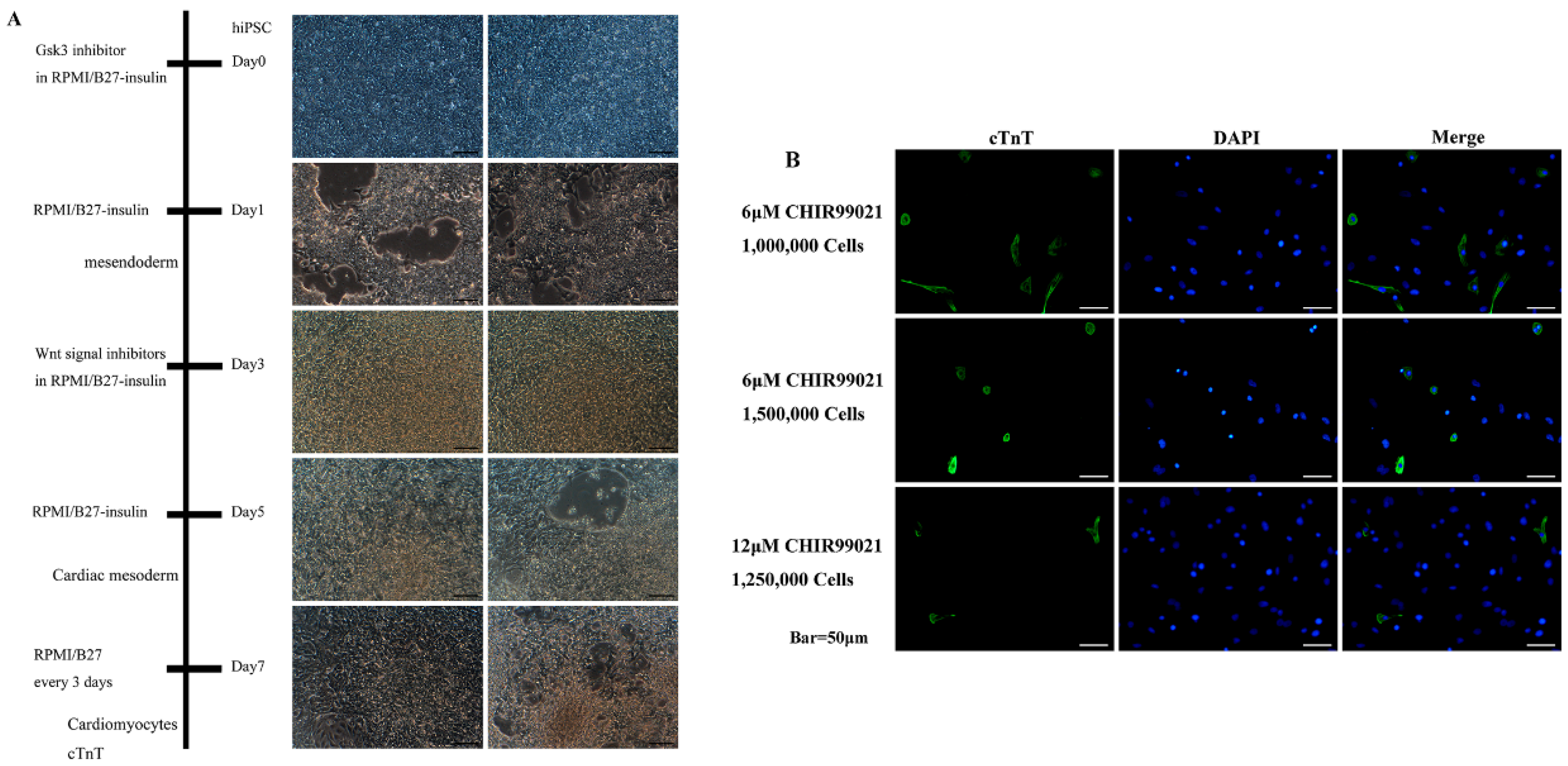 Figure 1. Induction of hiPSC differentiation into cardiomyocytes. (A) hiPSCs were induced to undergo differentiation. Scale bar = 100 μm. (B) Immunofluorescence staining of cardiac-specific marker cardiac troponin T (cTnT). Scale bar = 50 μm.
