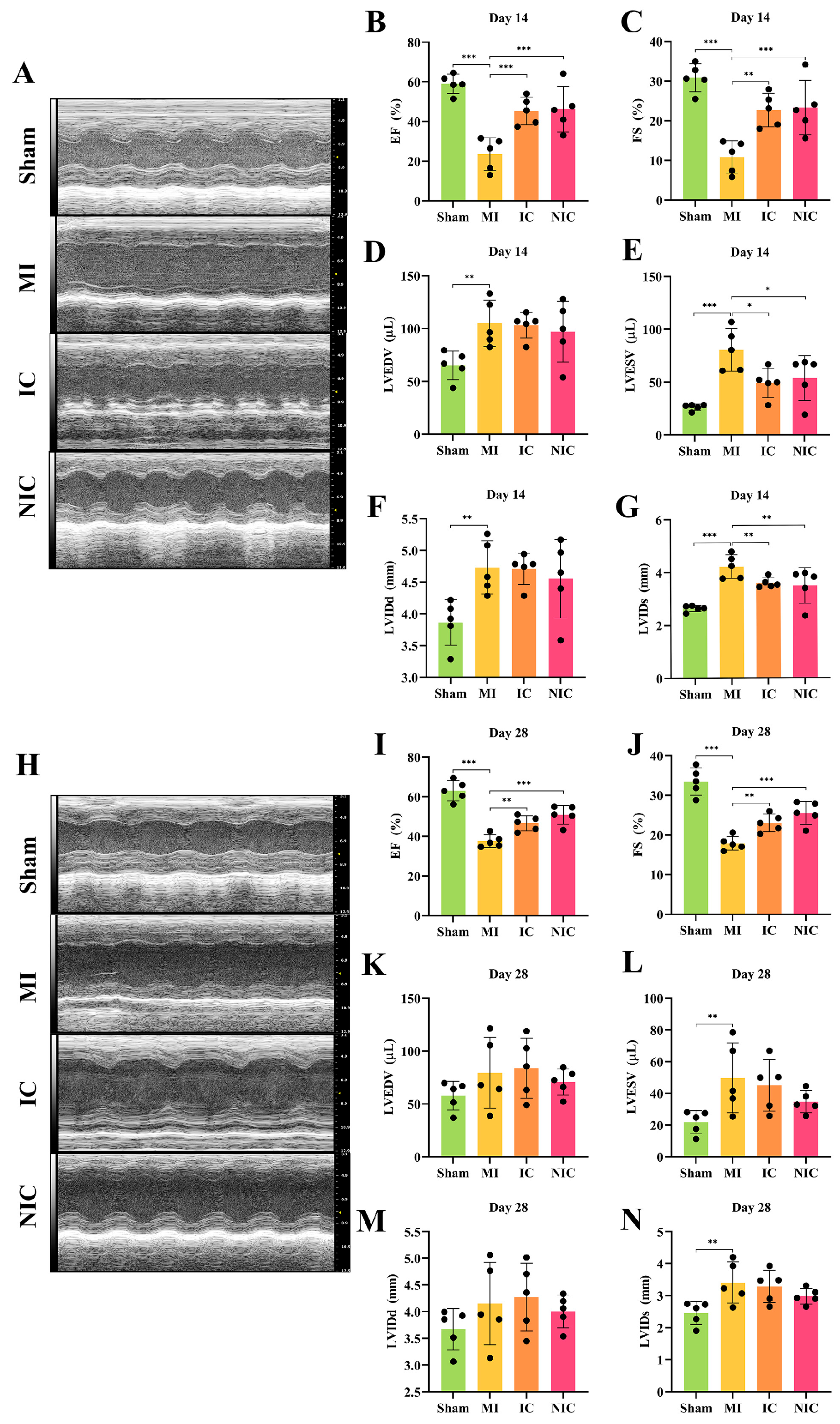 Figure 2. Transplantation of NGR1-pretreated hiPSC-CMs enhanced cardiac function. (A) Echocardiography of each group at 2 weeks following acute MI. (BG) Statistical analysis of EF, FS, LVEDV, LVESV, LVIDd, and LVIDs at 2 weeks. (H) Echocardiography of each group at 4 weeks. (IN) Statistical analysis of EF, FS, LVEDV, LVESV, LVIDd, and LVIDs at 4 weeks. *, p < 0.05, **, p < 0.01, ***, p < 0.001. n = 5.