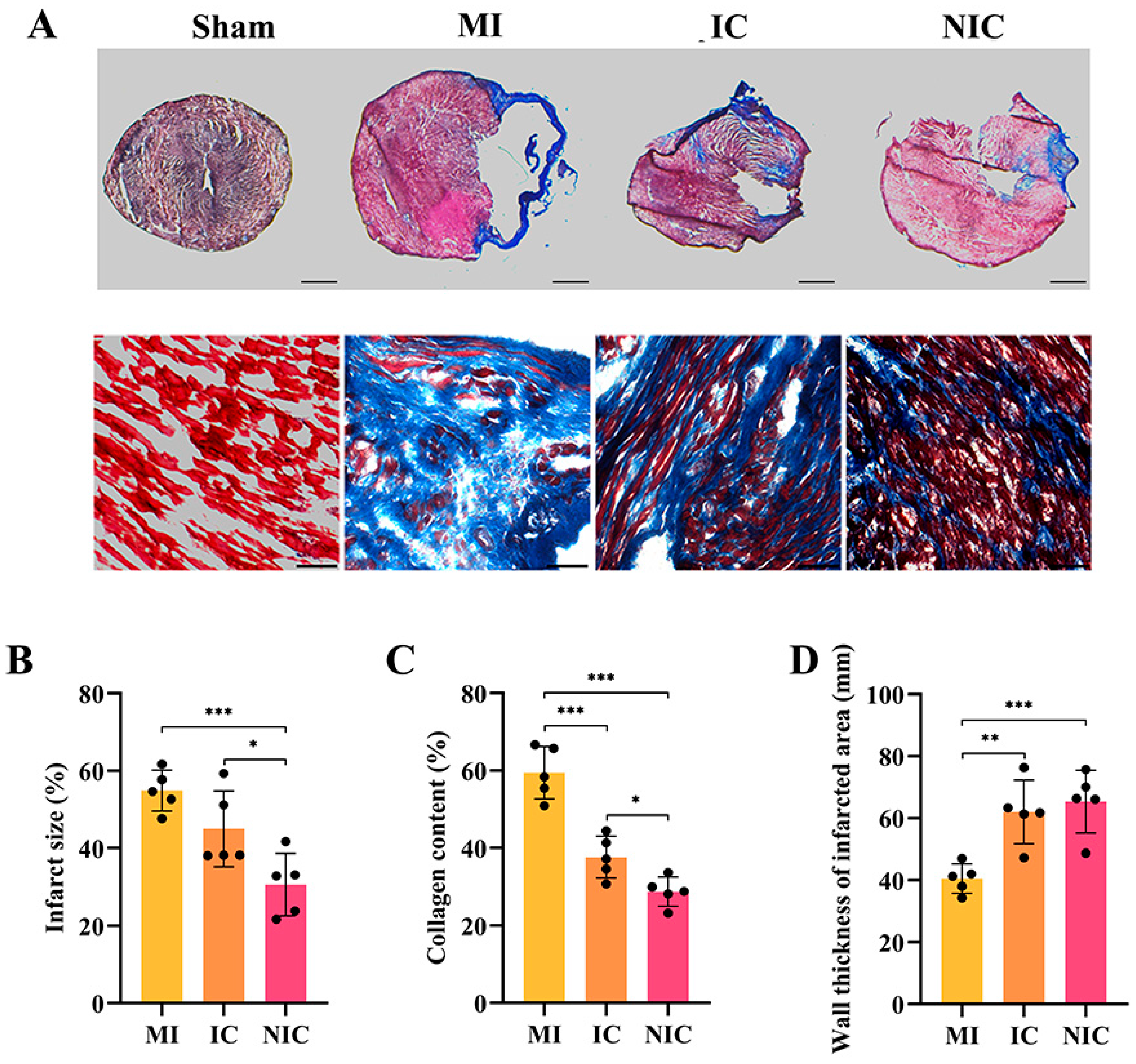 After the heart was fixed and dehydrated, it was embedded and frozen with OCT, and then sliced. The frozen slices were dried at room temperature for 10 min, washed three times with PBS, and stained overnight with Bouin at room temperature. Subsequently, Masson’s trichrome staining was performed according to the manufacturer’s instructions. For morphometric parameters, the percentage of infarct area was obtained by dividing the blue collagen area by the left ventricular area in the 8 bit mode of ImageJ (2.1.0).