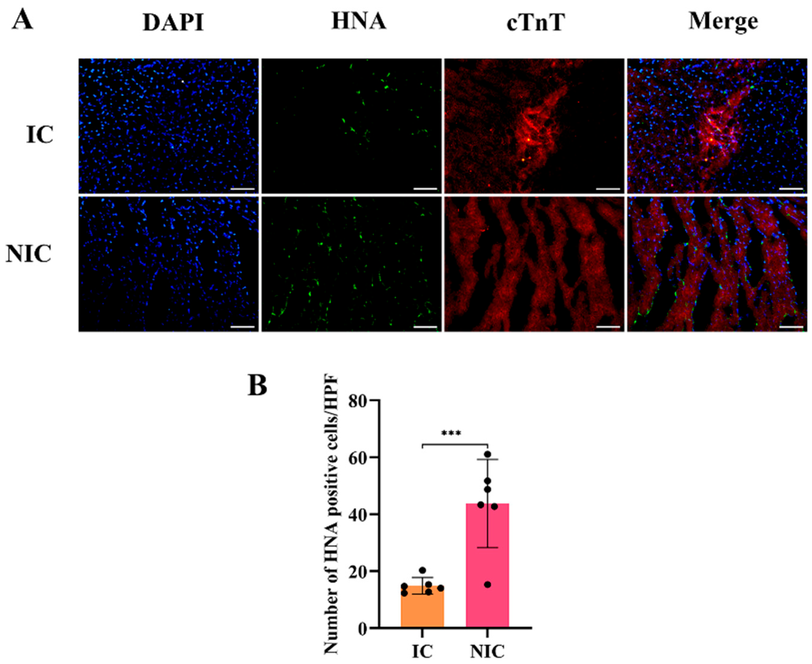 As the transplanted cells were human-derived, their survival and engraftment were determined through immunofluorescence staining of human nuclear antigen (HNA). HNA and cTnT staining indicated that the survival rate of the transplanted hiPSC-CMs in the NIC group was significantly higher than that in the IC group (Figure 4A,B). The NGR1 pretreatment further increased the survival of the transplanted hiPSC-CMs.