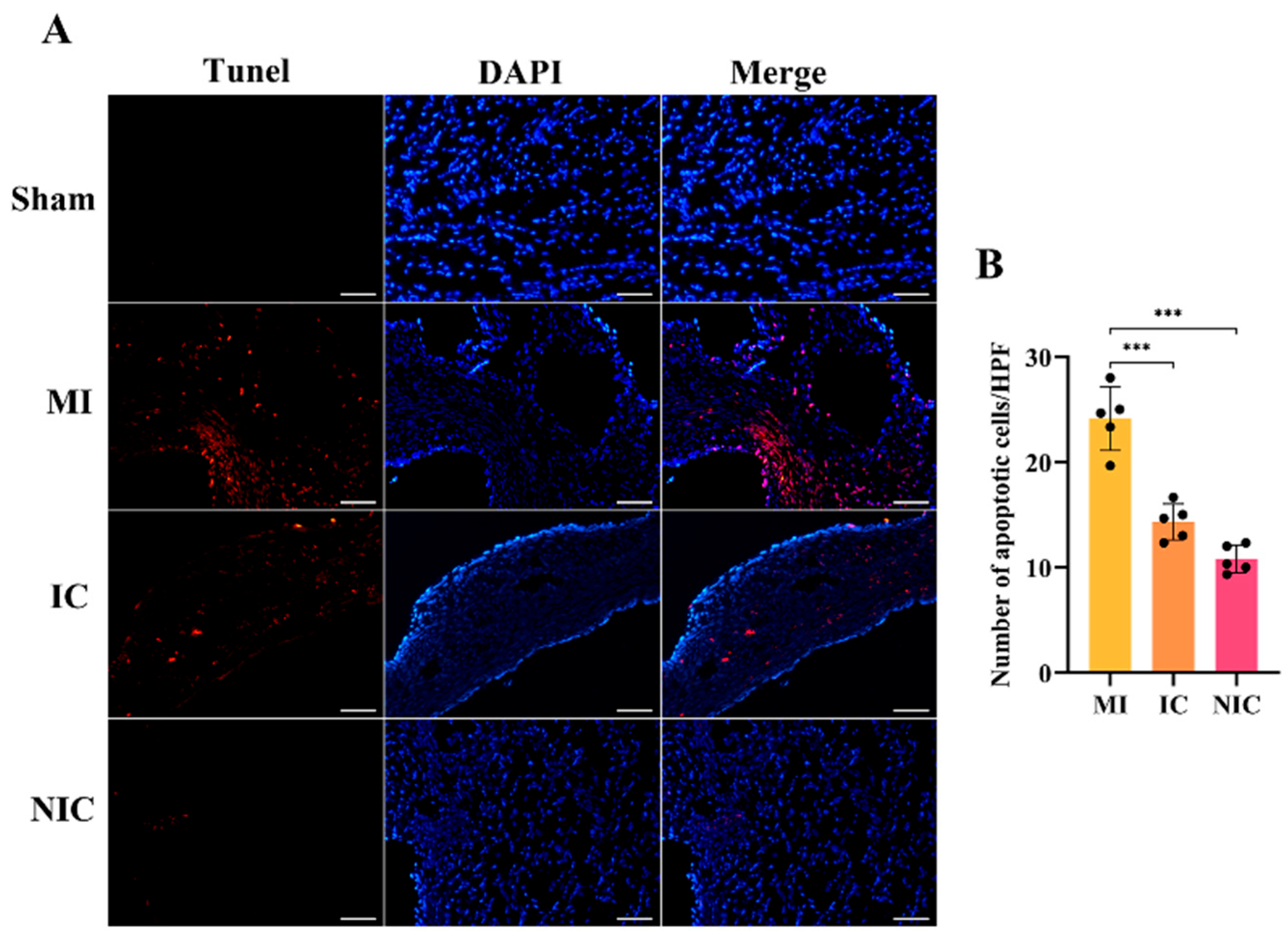 DAPI and TUNEL staining results revealed a significant increase in apoptotic cells following infarction. Transplantation of hiPSC-CMs reduced the number of apoptotic cells, while the transplantation of NGR1-pretreated hiPSC-CMs led to a more pronounced reduction in apoptosis compared to the hiPSC-CMs-only group (Figure 5A,B).