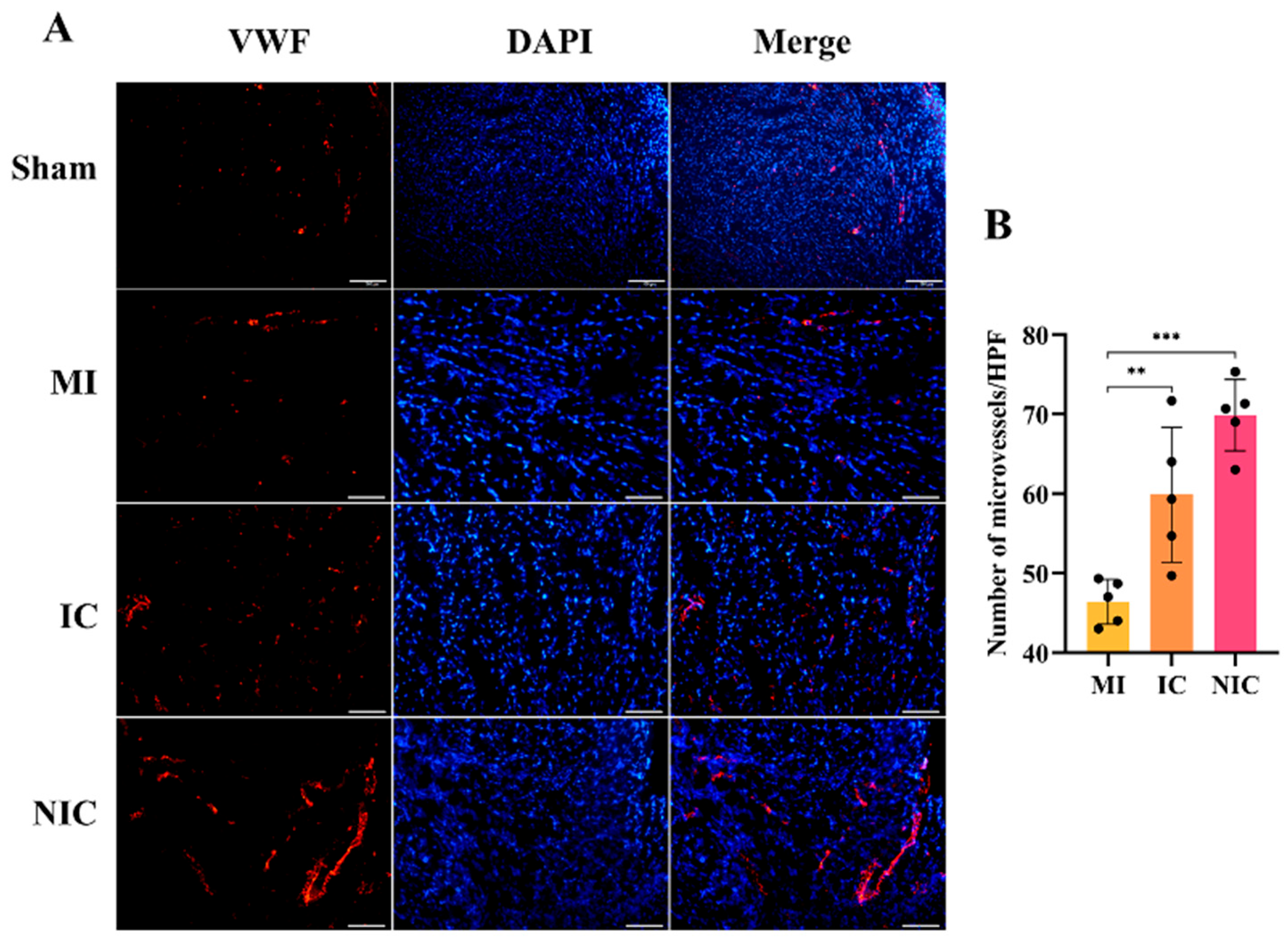 von Willebrand Factor (vWF) staining demonstrated that transplantation of hiPSC-CMs significantly increased the number of vWF-positive vessels. The NIC group exhibited a larger number of vWF-positive vessels than the IC group, indicating that transplantation of NGR1-pretreated hiPSC-CMs more effectively promoted angiogenesis in the infarcted region (Figure 6A,B). Angiogenesis can reduce the degree of MI, decrease cardiomyocyte apoptosis and necrosis, improve cardiac remodeling, and also improve the living environment of stem cells.
