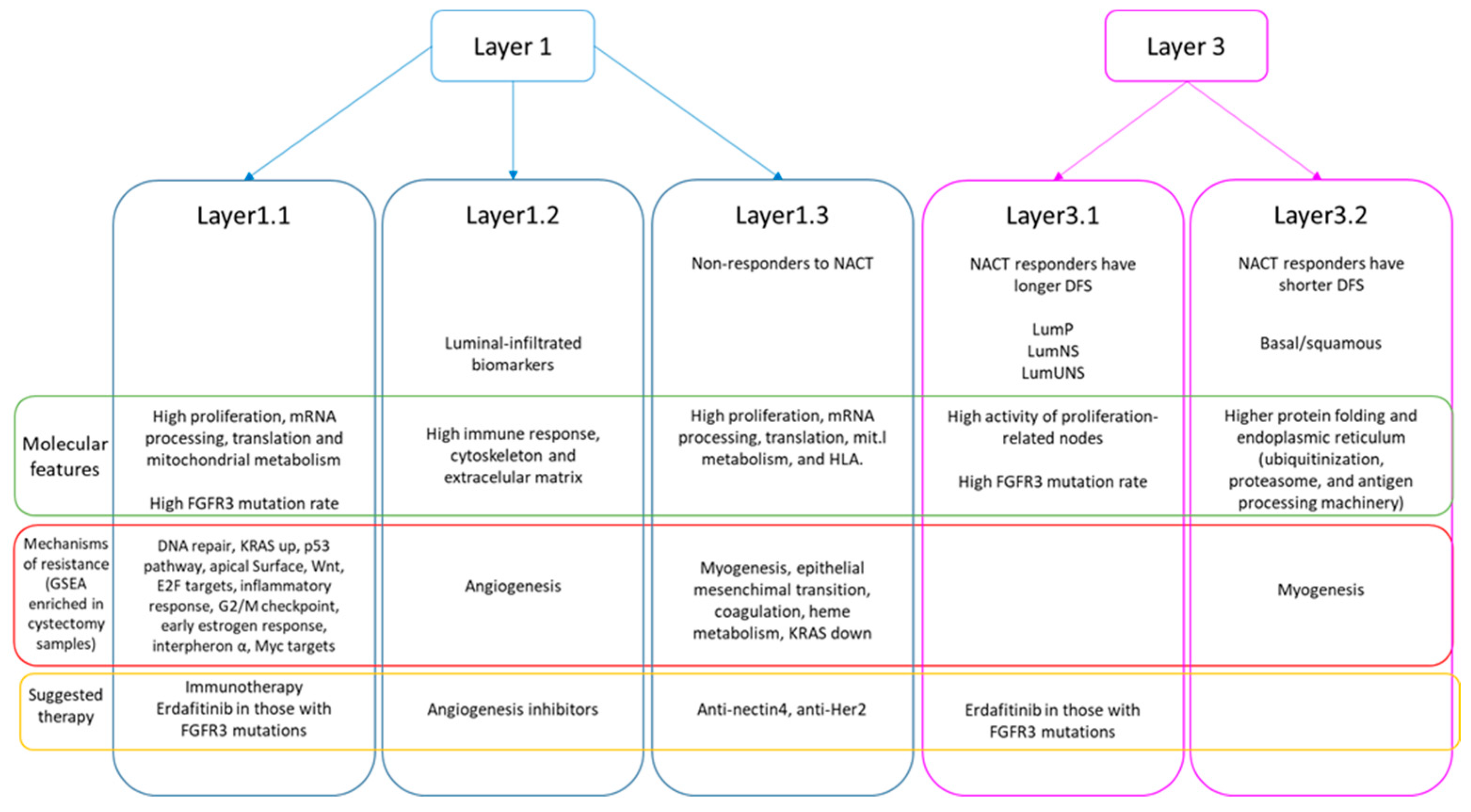 - Trilla-Fuertes, L.; Gámez-Pozo, A.; Prado-Vázquez, G.; Zapater-Moros, A.; Díaz-Almirón, M.; Arevalillo, J.M.; Ferrer-Gómez, M.; Navarro, H.; Maín, P.; Espinosa, E.; et al. Biological molecular layer classification of muscle-invasive bladder cancer opens new treatment opportunities. BMC Cancer 2019, 19, 636. [Google Scholar] [CrossRef]