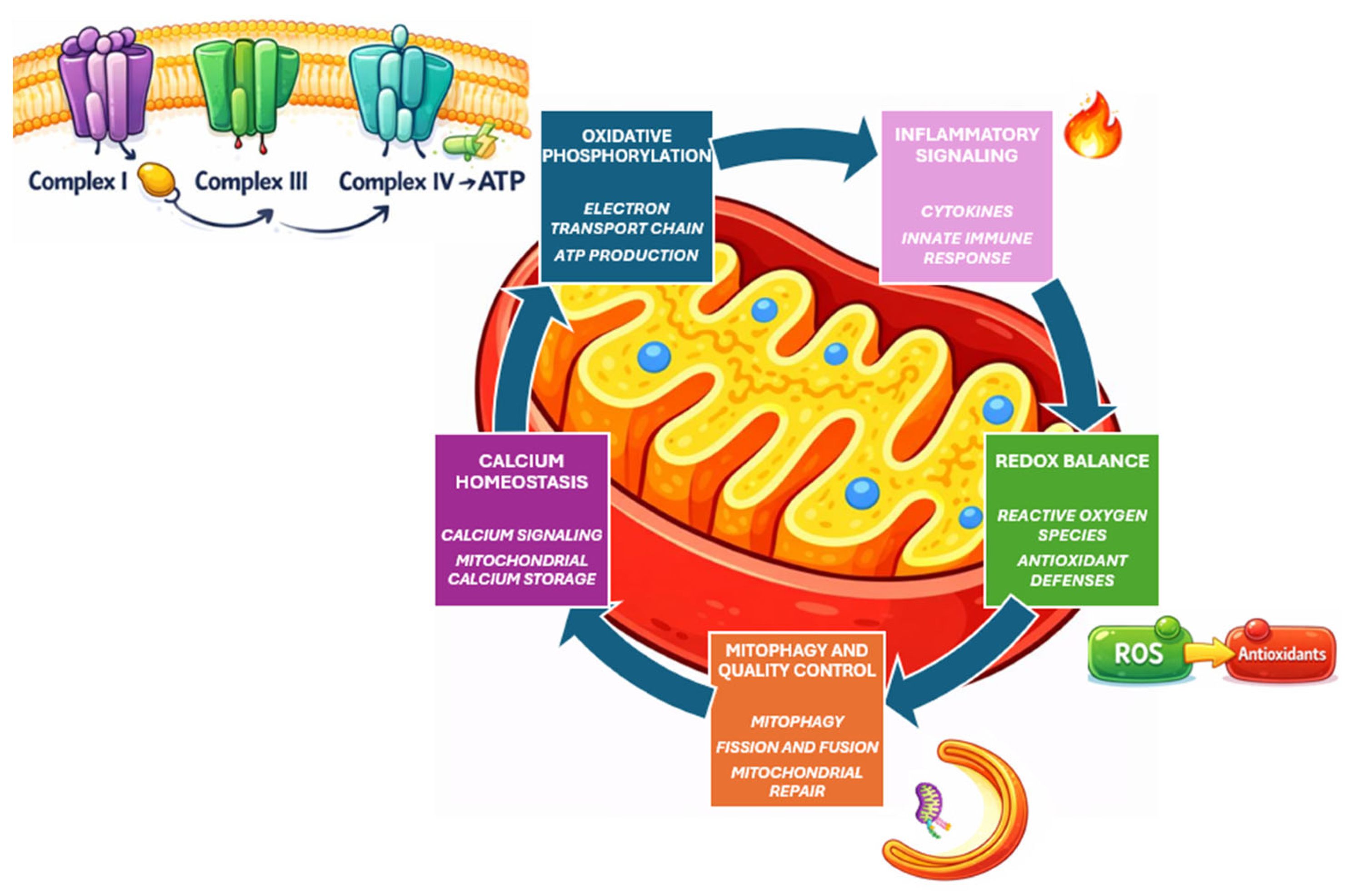 - Zong, Y.; Li, H.; Liao, P.; Chen, L.; Pan, Y.; Zheng, Y.; Zhang, C.; Liu, D.; Zheng, M.; Gao, J. Mitochondrial dysfunction: Mechanisms and advances in therapy. Signal Transduct. Target. Ther. 2024, 9, 124. [Google Scholar] [CrossRef] [PubMed]