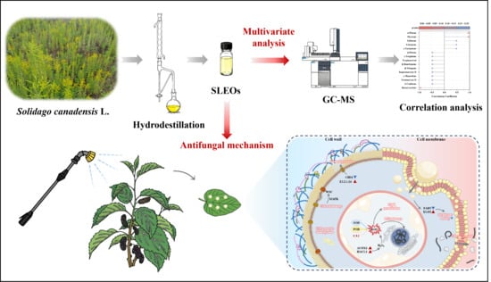 Essential oils (EOs) are complex volatile mixtures derived from the secondary metabolites of aromatic plants, primarily composed of hydrophobic terpenoids and phenylpropanoids [26,27]. High volatility and lipophilic nature of EOs enable their rapid penetration into microbial cells, making them potential antifungal agents [28,29,30]. Furthermore, EOs are biodegradable and exert minimal effects on non-target species, not only slowing the development of resistance but also avoiding toxic effects on beneficial insects [31]. S. canadensis L. EOs (SLEOs) have been examined in various studies. Liu et al. [32] investigated the antifungal activity of SLEOs against Botrytis cinerea on strawberry fruits. The results indicated that the inhibitory effect of SLEOs on B. cinerea mycelial proliferation exhibited strong concentration dependency, with higher treatments causing progressively greater growth restriction. SLEO vapor at 0.1 mL/L maintained high sensory acceptability of strawberries while reducing gray mold incidence. Elshafie et al. [33] identified 32 constituents in SLEOs, with germacrene D, β-elemene, α-pinene, D-limonene, and bornyl acetate being the major ones. Previous studies have shown that SLEOs exhibit significant inhibitory activity against several plant pathogenic bacteria and postharvest plant pathogenic fungi. Therefore, SLEOs serve as potential natural fungicides.