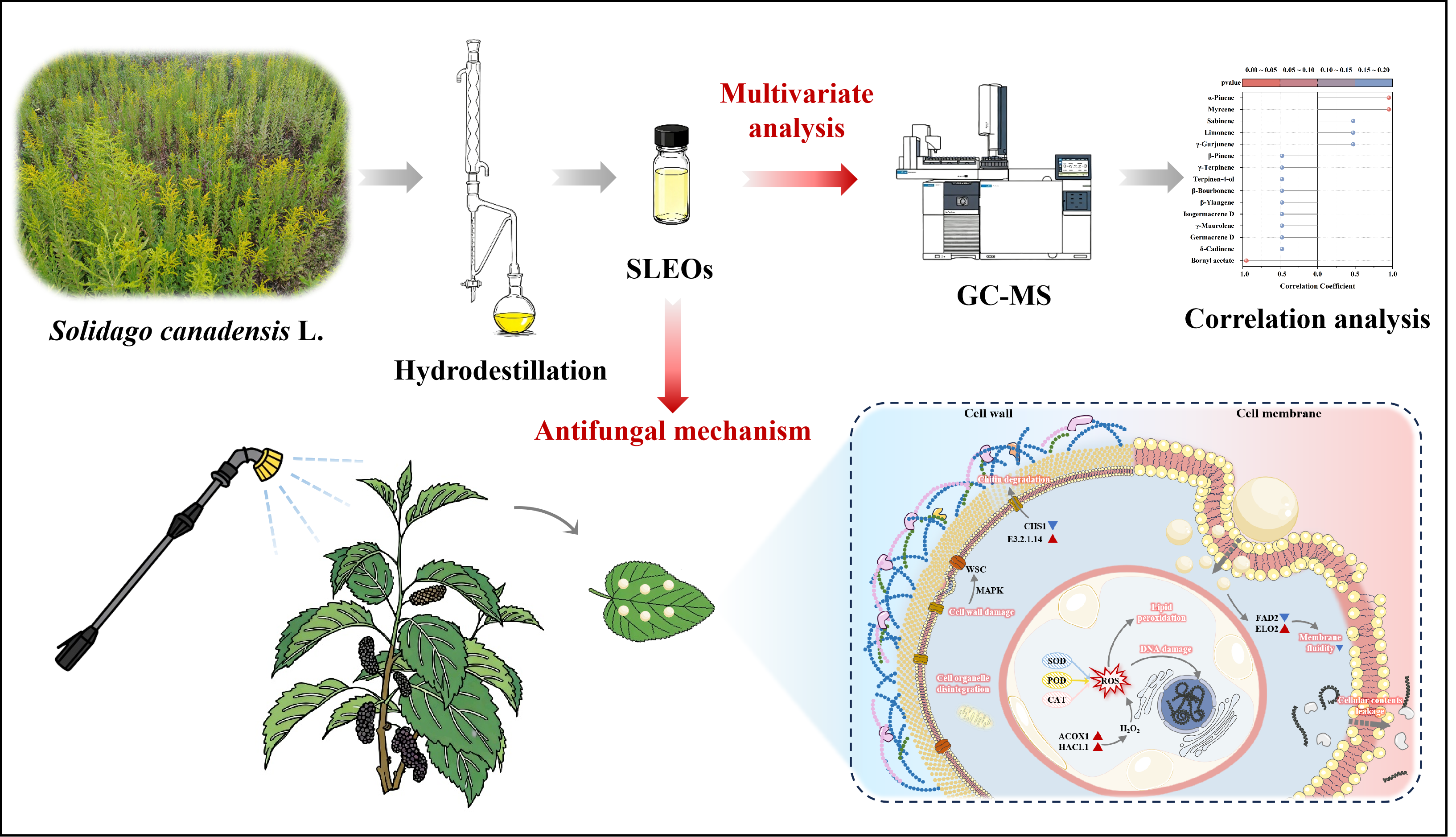 However, no reports currently exist on the inhibition of C. shiraiana by SLEOs, and the antimicrobial components and mechanism of SLEOs require extensive investigation. Therefore, this study first identified the chemical composition of EOs extracted from different parts of S. canadensis L. using GC–MS. Multivariate statistical analyses, including principal component analysis (PCA), UpSet, partial least squares-discriminant analysis (PLS-DA), and correlation analysis, were employed to screen for the key components most strongly correlated with the antifungal efficacy of SLEOs. Finally, transcriptomic analysis was integrated with physiological and biochemical analyses to elucidate the antifungal mechanism against C. shiraiana. This research not only provides practical strategies for the sustainable management and efficient utilization of S. canadensis L. but also offers an effective control measure for mulberry sclerotia diseases.