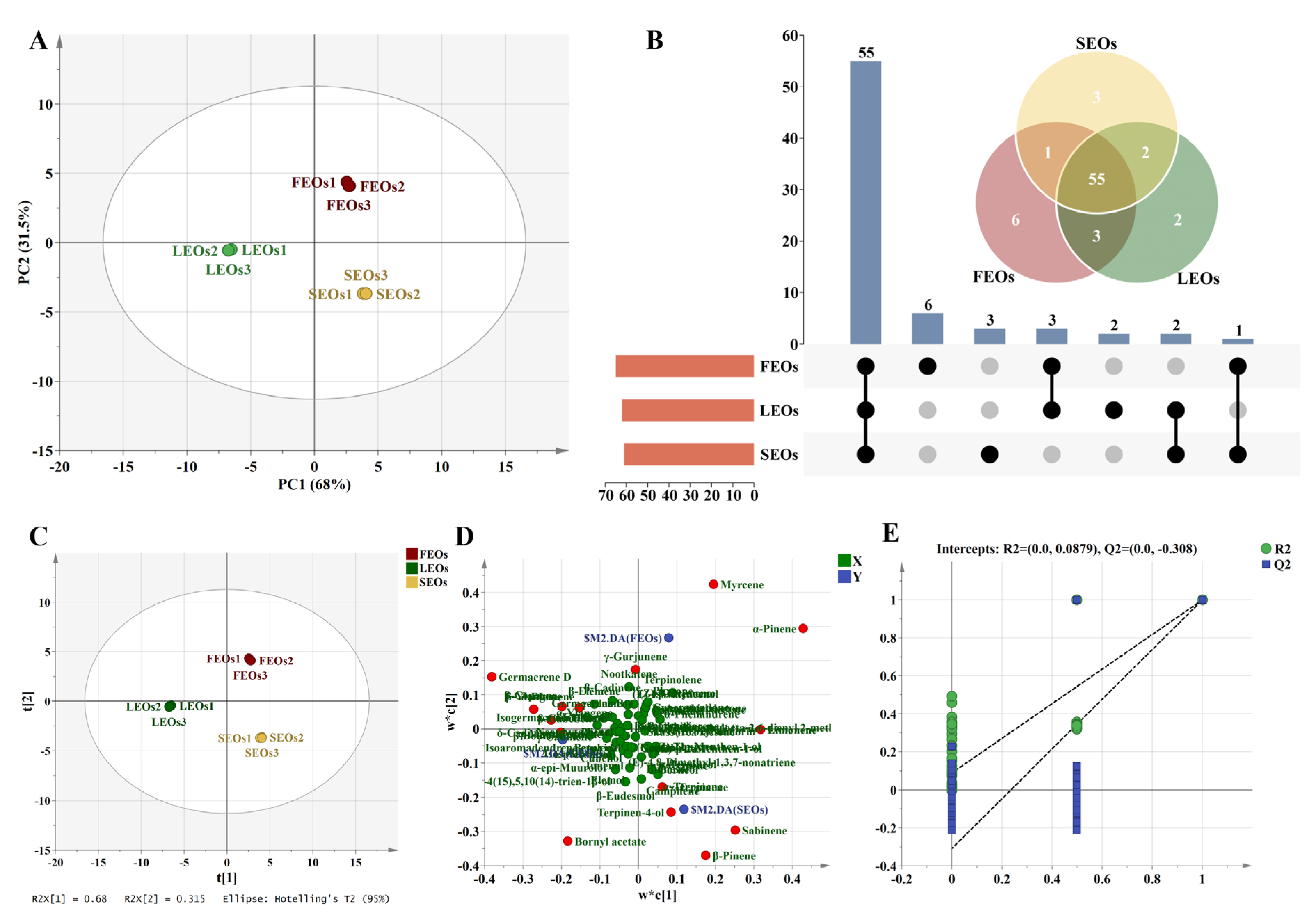 Figure 2. Multivariate statistical analyses of SLEOs. (A) PCA score map; (B) UpSet plot and Venn plot; (C) Score plot; (D) Loading plot; (E) Fitting curve of 200 permutation tests.