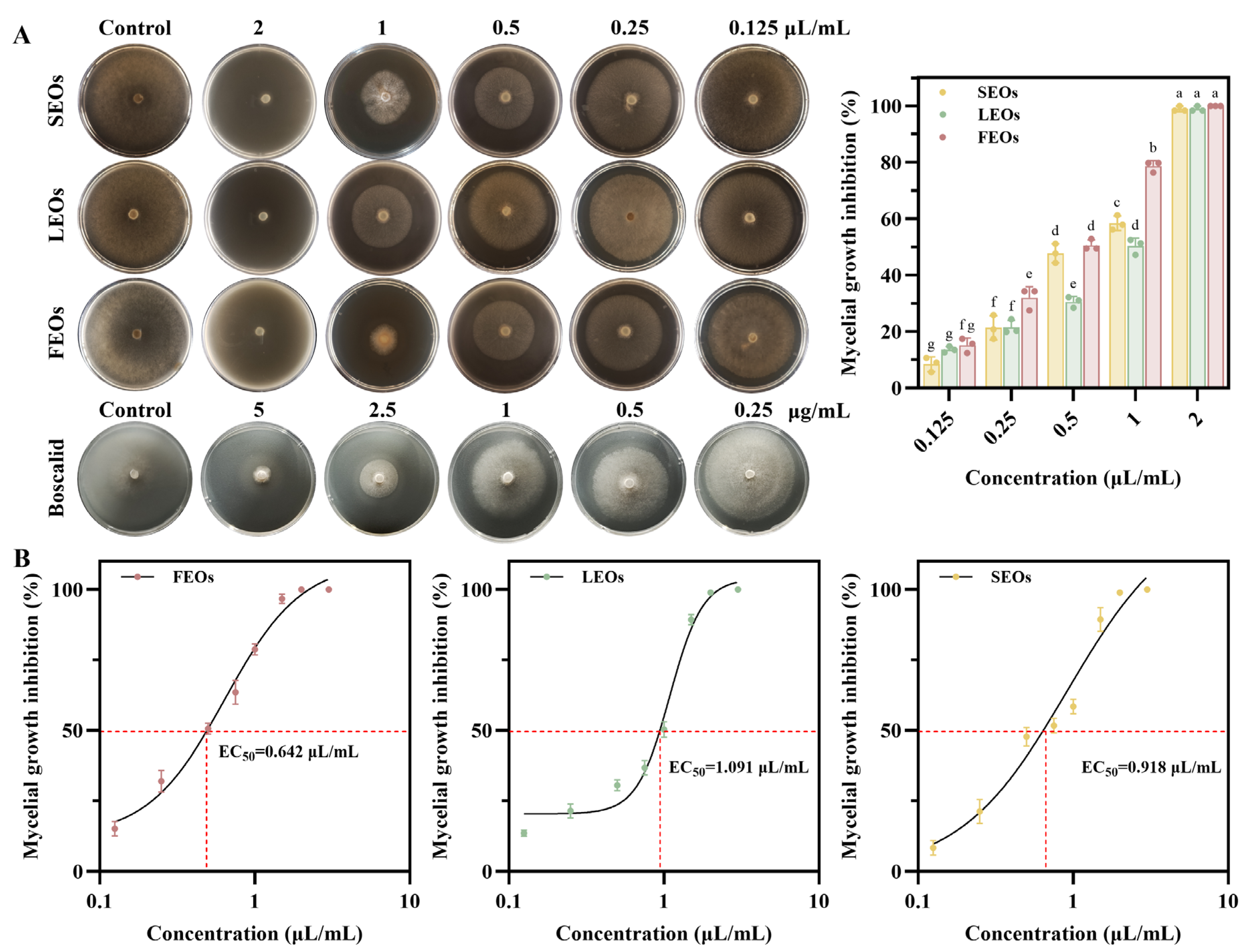 Figure 4. (A) Inhibitory activity of mycelial growth on PDA medium; (B) EC50 of FEOs, LEOs, and SEOs. Discs measured 6 mm in diameter, and values represent means ± standard deviations (p < 0.05). Means with different letters in a row are statistically significant (p < 0.05).
