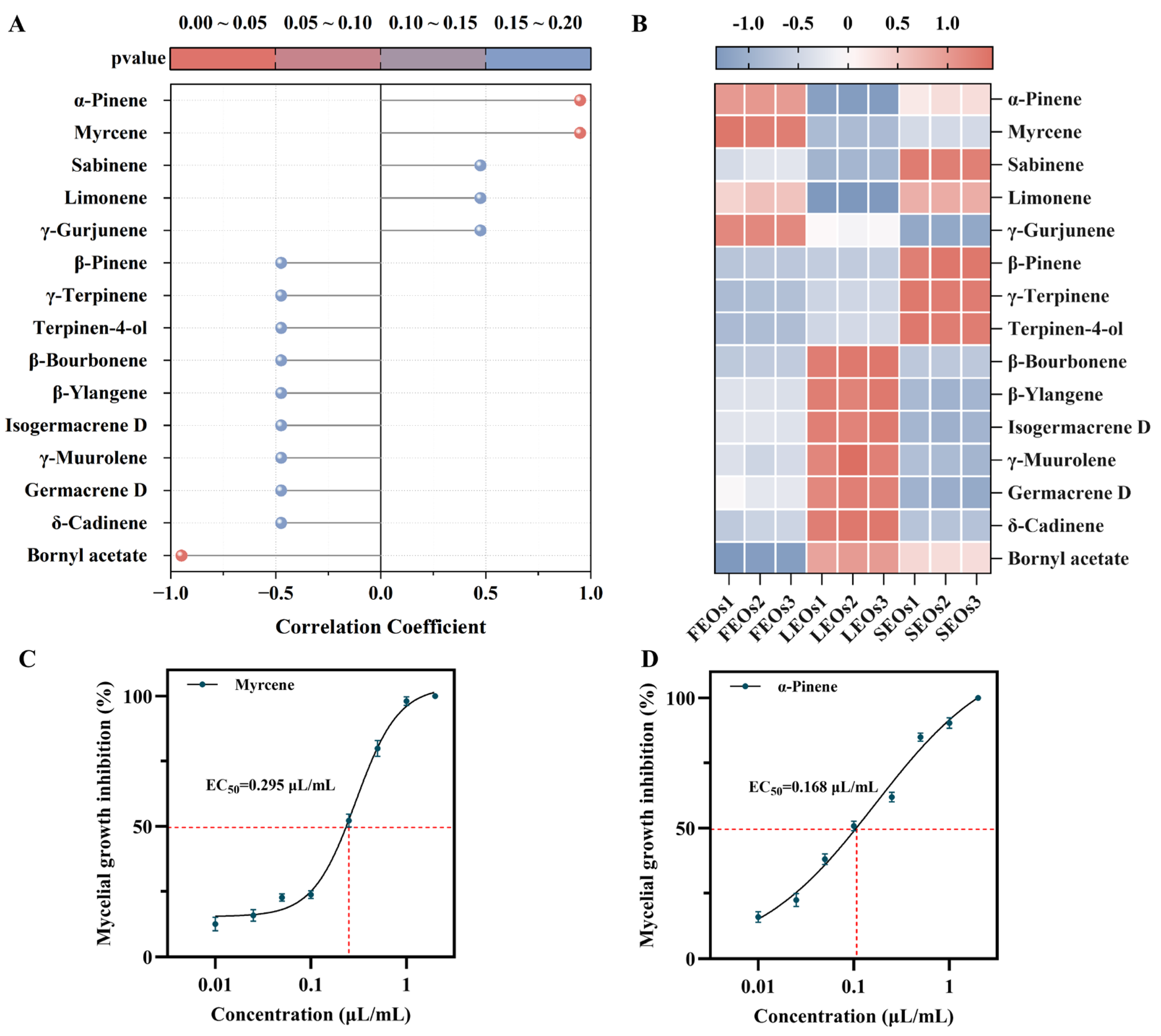 Figure 5. (A) Lollipop plot and (B) heatmap derived from Spearman correlation analysis between key components of SLEOs and antifungal properties; EC50 of (C) myrcene and (D) α-pinene.