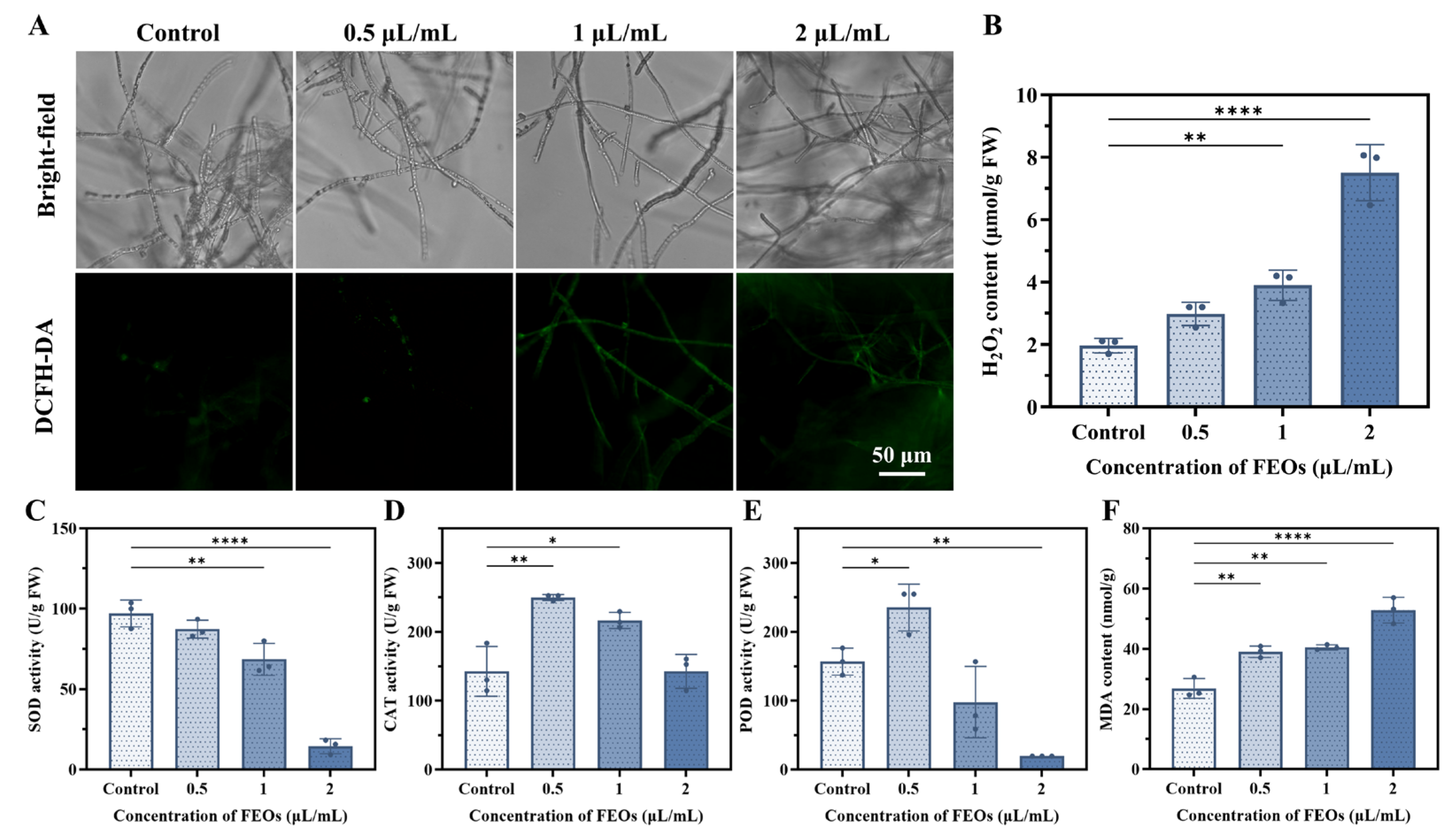 The ROS level was determined according to a previously reported method [53]. A small amount of mycelium treated with FEOs was washed three times with 0.1 M PBS and subsequently incubated with 10 μM DCFH-DA fluorescent probe for 20 min at 37 °C under dark conditions. After repeated PBS washing, the mycelium was subjected to fluorescence microscopic examination and image acquisition (CKX31, OLYMPUS, Co., Ltd., Tokyo, Japan).