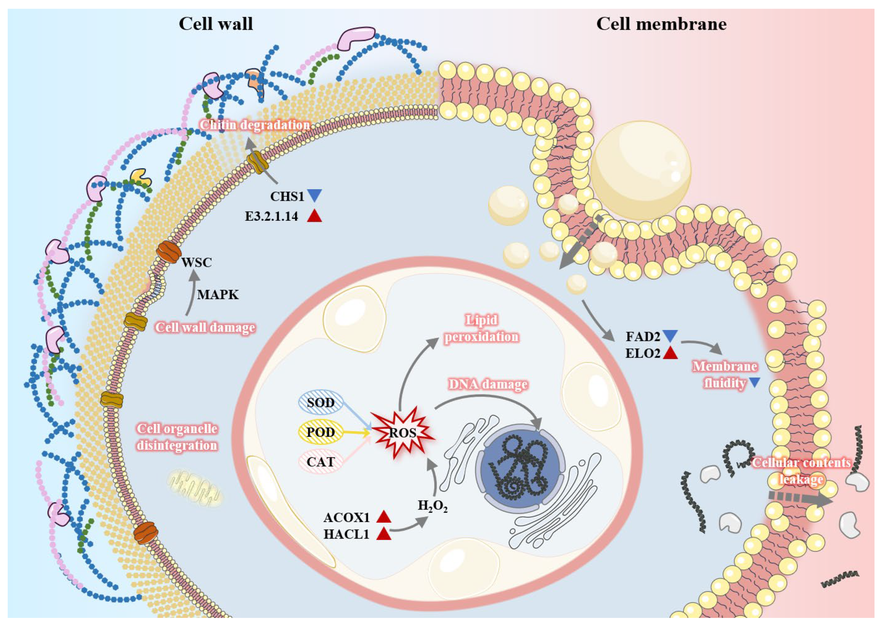 Figure 11 illustrates the proposed mechanism of action of FEOs against C. shiraiana, derived from integrated transcriptomic sequencing and analysis. First, FEOs induce degradation of chitin and thinning of the cell wall by bidirectionally regulating CHS1 and E3.2.1.14, thereby compromising cell wall integrity. Concurrently, FEOs inflict irreversible damage on the cell membrane by disrupting its fluidity and structural integrity. Subsequently, FEOs penetrate through the damaged cell wall and membrane to enter the cell, while large molecules within the cell (such as nucleic acids and proteins) leak out. Furthermore, FEOs inhibit the activities of key antioxidant enzymes, including SOD, POD, and CAT, resulting in the dysfunction of the antioxidant enzyme system. This enzymatic disruption promotes intracellular ROS accumulation and oxidative stress, initiates membrane lipid peroxidation, and induces DNA damage in C. shiraiana, thereby impairing its reproductive capacity and genetic stability.