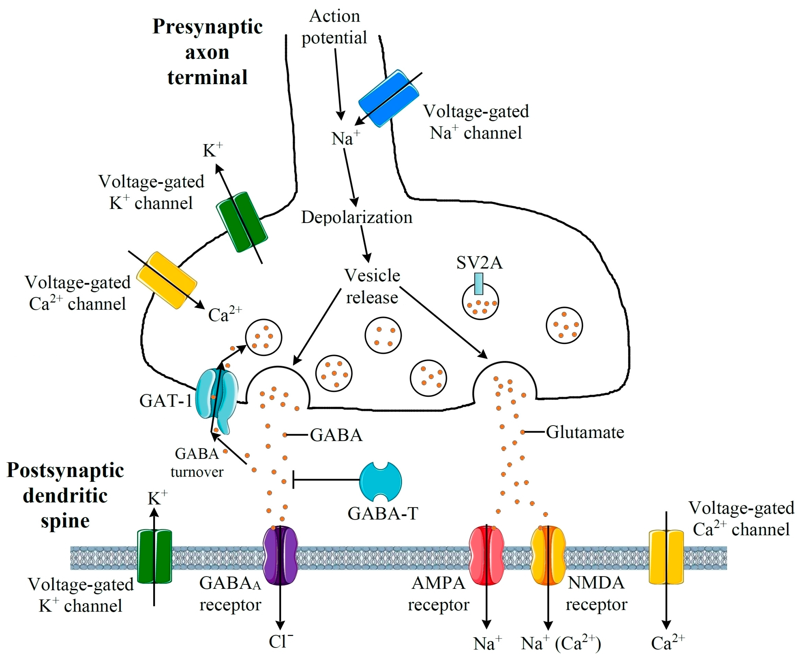 - Dynamics of AMPA-Rs, NMDA-Rs and GABA-Rs, which are key regulators of excitatory and inhibitory synaptic transmission.