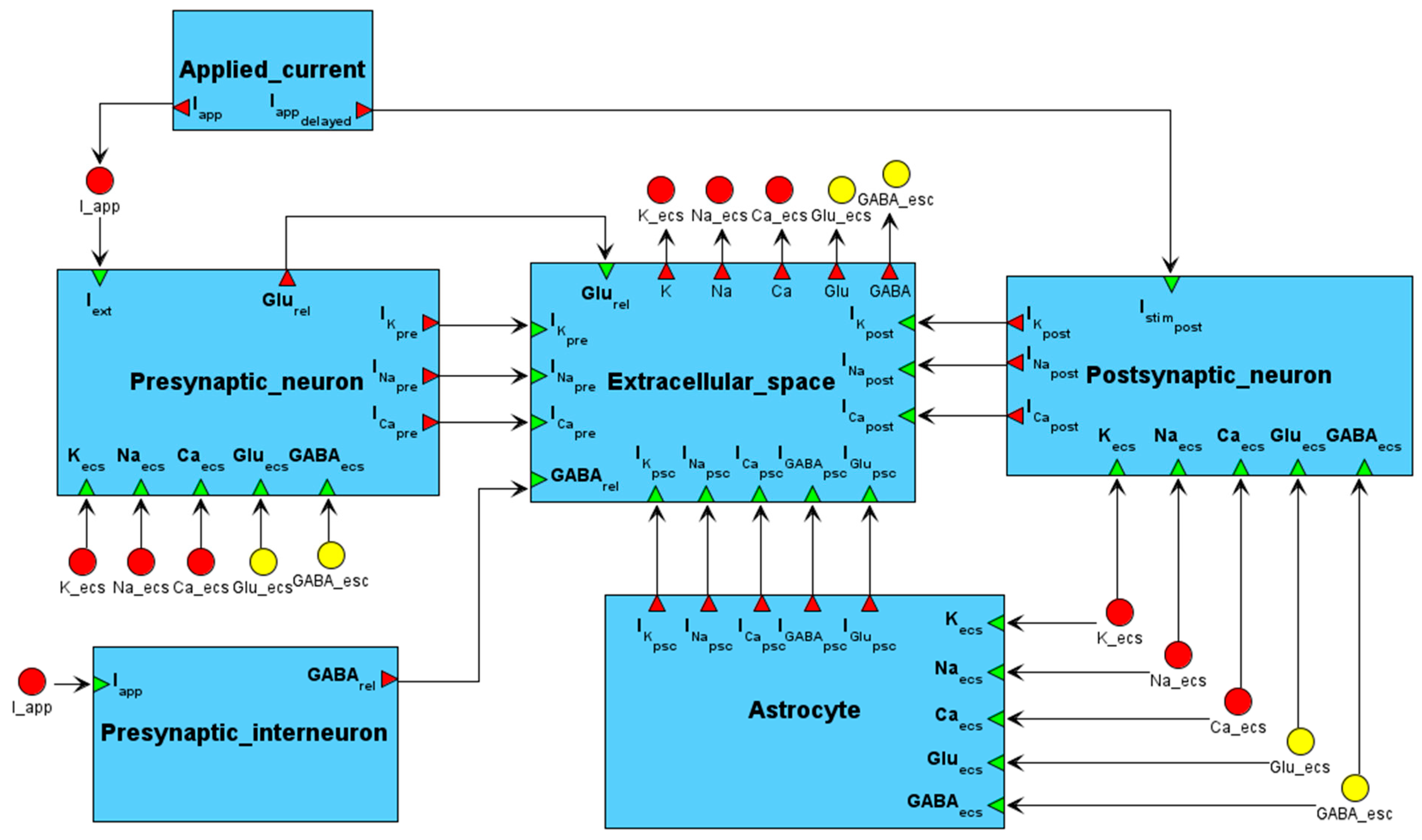 - Externally applied electrical current (Applied_current): This auxiliary module calculates stimulating currents for the presynaptic neuron, postsynaptic neuron, and interneuron.