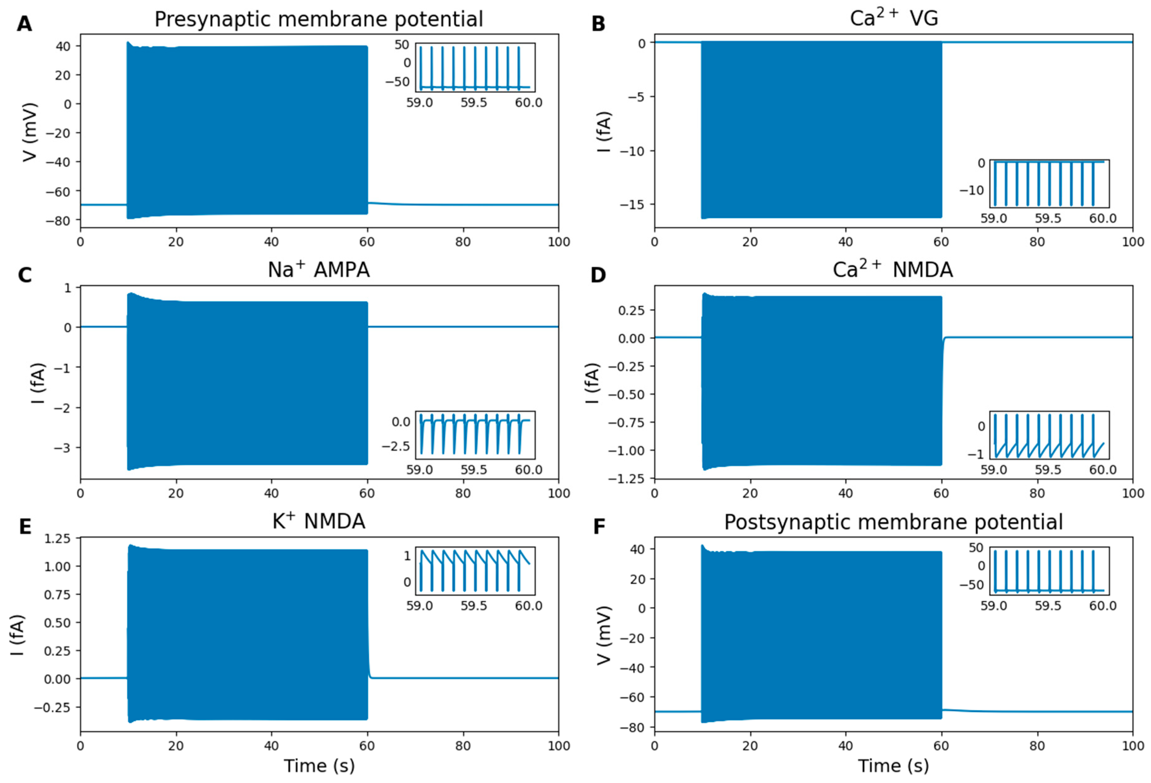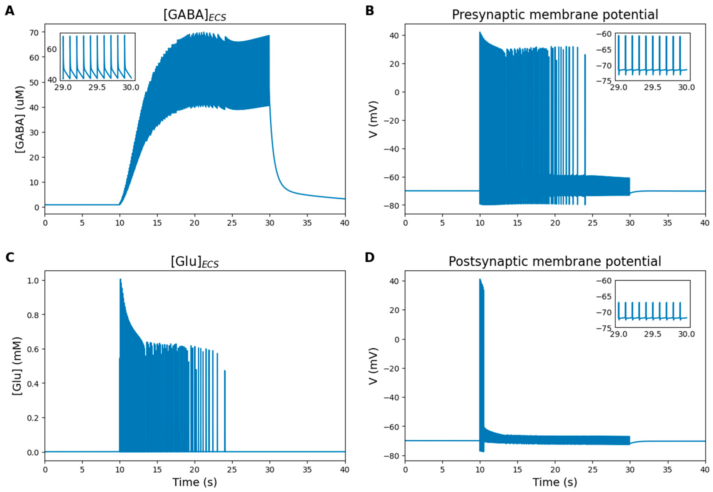 - Postsynaptic neuron (Postsynaptic_neuron): This module describes the dynamics of the postsynaptic dendritic spine, including voltage-gated ion channels, NKA, PMCA, AMPA-Rs, NMDA-Rs, as well as GABAA-Rs activated by astrocyte-mediated tonic GABA signaling, and a weak external stimulus. Ion fluxes across the membrane are also computed.