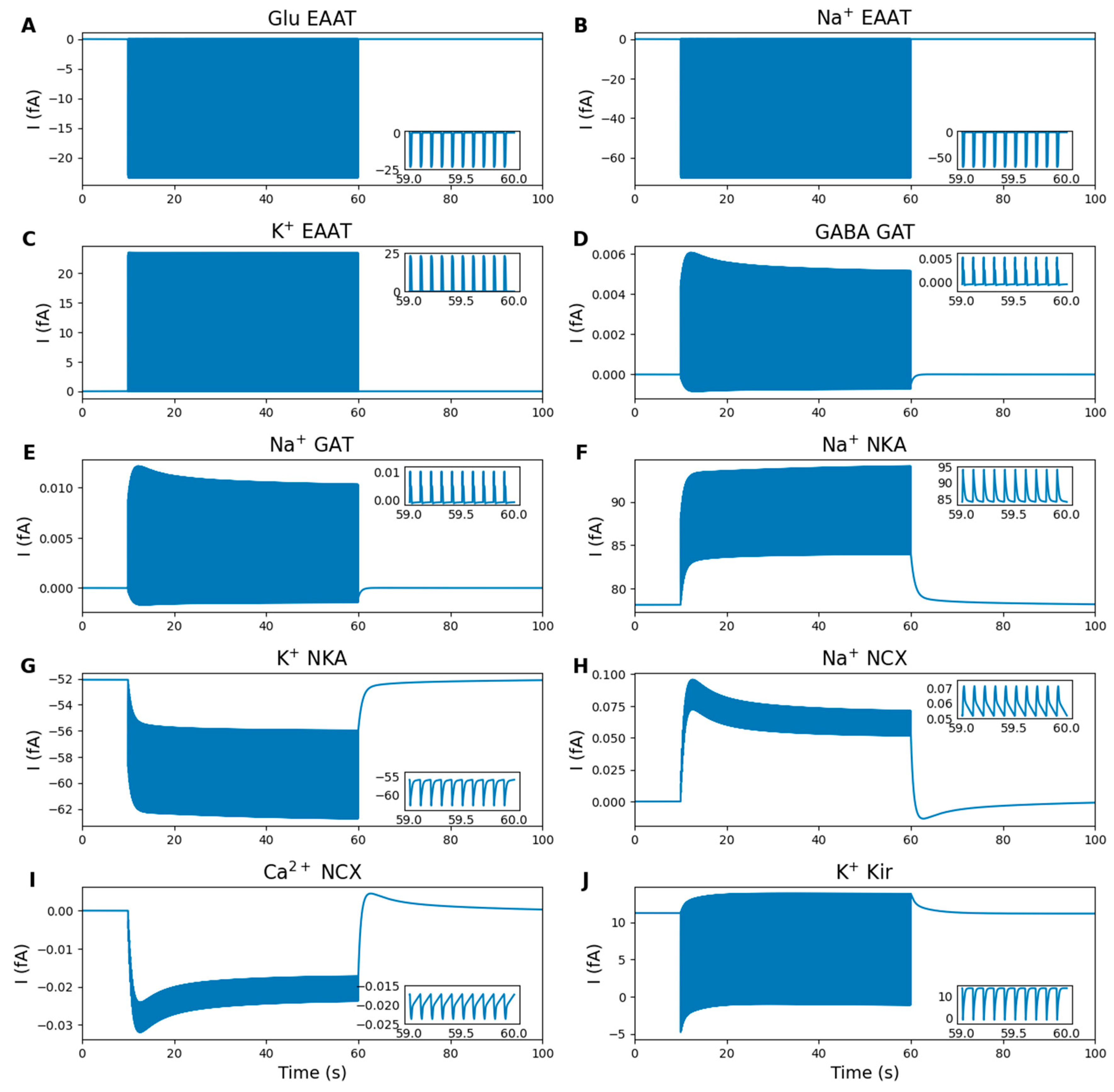 - Perisynaptic astrocyte (Astrocyte): This module describes the dynamics of the astrocyte, including the excitatory amino acid transporter 2 (EAAT-2), the sodium-calcium exchanger (NCX), NKA, inwardly rectifying potassium channel (Kir4.1), and the GABA transporter 3 (GAT-3). Ion diffusion within the astrocytic process is considered, along with ion and neurotransmitter fluxes across the membrane.