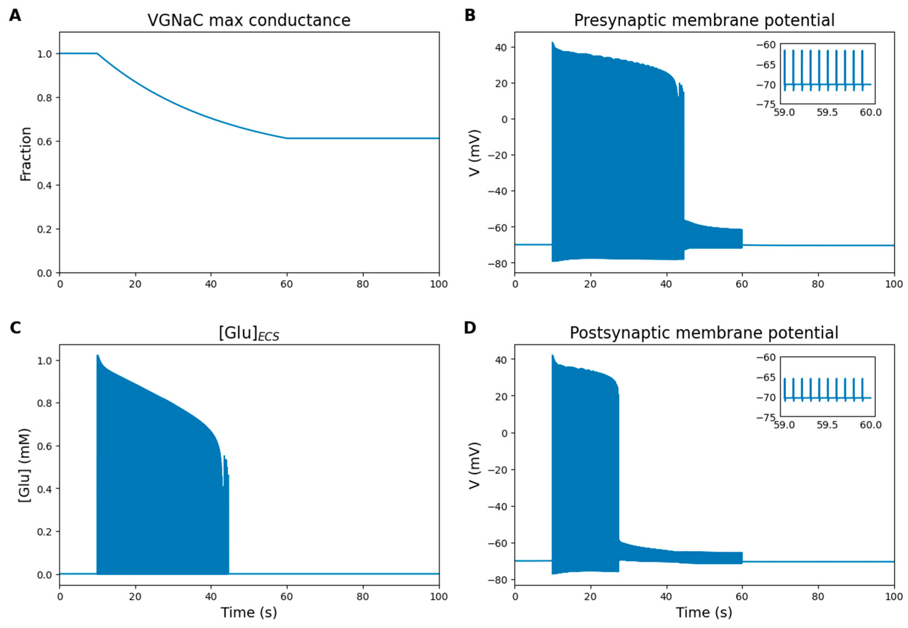 - Presynaptic neuron (Presynaptic_neuron): Module that describes the dynamics of the presynaptic axon terminal, incorporating voltage-gated ion channels, sodium-potassium and calcium ATPases (NKA and PMCA), GABAA-Rs involved in tonic astrocyte-mediated modulation, and external stimulus. It calculates the concentration of glutamate released into the extracellular space, with the release rate primarily determined by presynaptic calcium entry, while being modulated by the dynamics of mGlu-Rs and GABAB-Rs. Ion fluxes across the membrane are calculated as well.