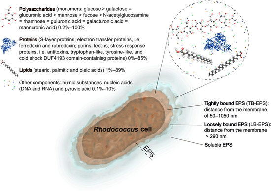 EPSs contain several types of biopolymers, including carbohydrates, proteins, nucleic acids, and sometimes lipids. Depending upon the chemical composition of exopolymers, they might exhibit various capabilities, such as adsorption, biodegradability, and hydrophilicity/hydrophobicity, and thus find applications in various spheres. The main constituents of Rhodococcus EPSs are considered to be polysaccharides (up to 100%) and proteins (up to 85%); less frequently lipids (up to 89%, typically 1–10%); and in the least amounts nucleic acids, humic substances, and pyruvic acid (0.1–10%) (Figure 1, Table 1).