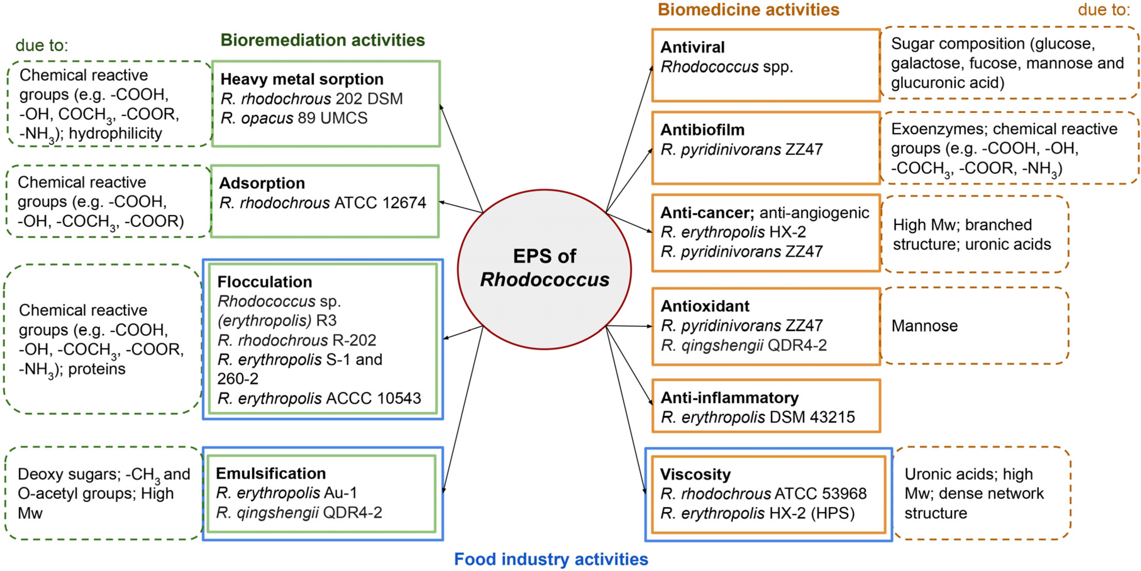 | R. rhodochrous R-202 | R-202 | 1.3 × 106 | 62.86% of polysaccharide and 10.36% of protein. Mannose, glucose, and galactose at a molar ratio of 12:6:1. | Flocculation (effective at pH around 7 and in salt solutions) | [51] |