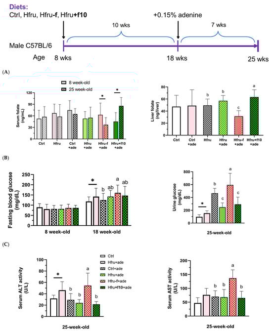 Experimental design of the study and metabolic parameters in an adenine-induced murine model of chronic kidney disease (CKD). (A) serum and hepatic folate levels in mice before (8-week-old) and after (25-week-old) the experiment diets. (B) fasting blood glucose and urinary glucose levels. (C) serum alanine aminotransferase (ALT) and aspartate aminotransferase (AST) activities. Data are presented as mean ± SD (n = 12 per group). * p < 0.05 versus the Ctrl group. Different letters indicate significant differences among adenine-induced groups (p < 0.05; (A) one-way ANOVA with Duncan’s post hoc test, (B,C) Kruskal–Wallis tests followed by Bonferroni-corrected Mann–Whitney U post hoc tests).