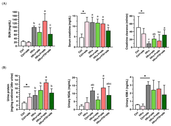 Kidney function parameters in an adenine-induced murine model of CKD under dietary folate and fructose conditions. (A) blood urea nitrogen (BUN), serum creatinine, and creatinine clearance. (B) twenty-four-hour urinary total protein, neutrophil gelatinase–associated lipocalin (NGAL), and kidney injury molecule-1 (Kim-1). Values are mean ± SD (n = 12 per group). * p < 0.05 versus the Ctrl group. Different letters indicate the significant differences among adenine-induced groups. (p < 0.05; (A) one-way ANOVA with Duncan’s post-hoc test, (B) Kruskal–Wallis tests followed by Bonferroni-corrected Mann–Whitney U post hoc tests).